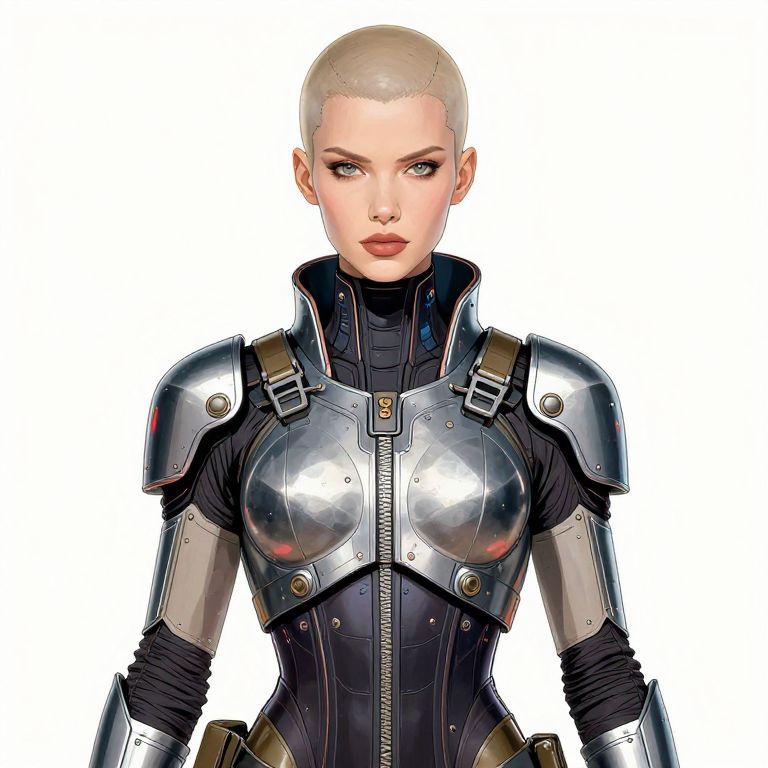 Digital artwork of a fierce red-haired woman in black, armored, form-fitting suit with silver shoulder plates, standing against a golden, floral, Art