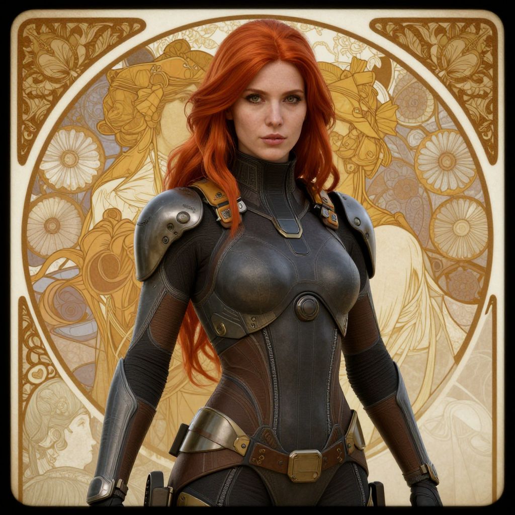 Photorealistic digital artwork of a red-haired woman in a form-fitting, black leather and metal armor suit. She has fair skin, a determined expression, and wavy red hair. Her armor features metallic shoulder plates and a belt with pouches. The background is ornate, with gold floral patterns and an Art Nouveau-inspired circular design. The woman stands confidently in the center, with the intricate background enhancing her strong, heroic presence. The artwork combines realistic textures with stylized elements, creating a striking, fantasy-inspired visual.
