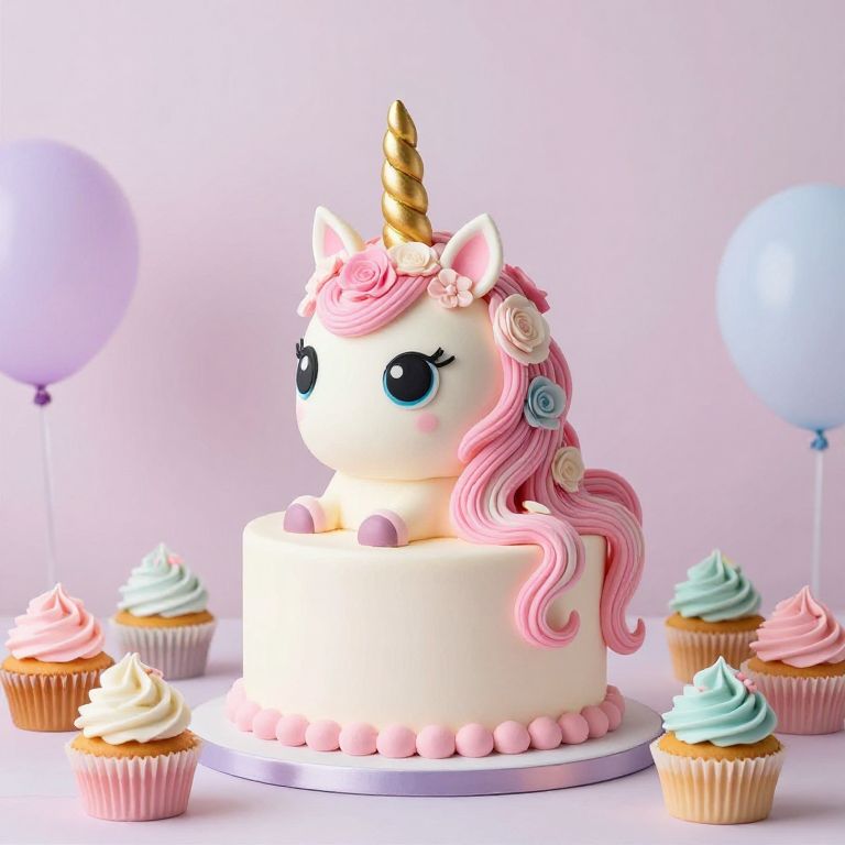 A whimsical birthday celebration bursts to life with a magical unicorn cake crowned by a golden horn and pink floral mane, surrounded by pastel cupcakes that seem to dance in a dreamlike tableau.