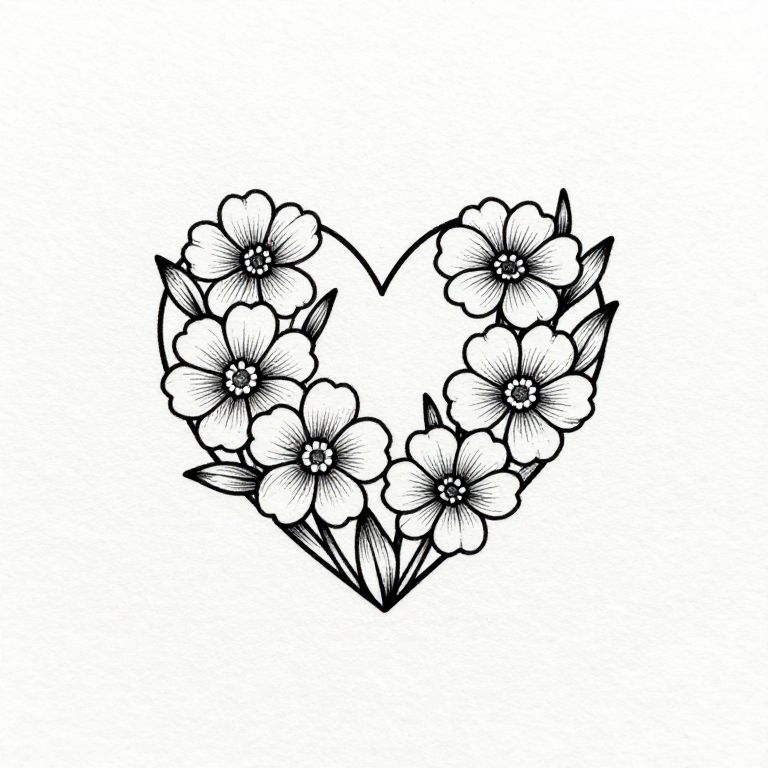 Heart with flowers drawing, minimalist black ink on white paper, clean and precise lines forming a heart filled with blooming flowers, modern and stylish aesthetics, subtle shading details, perfect for tattoo inspiration or decorative art