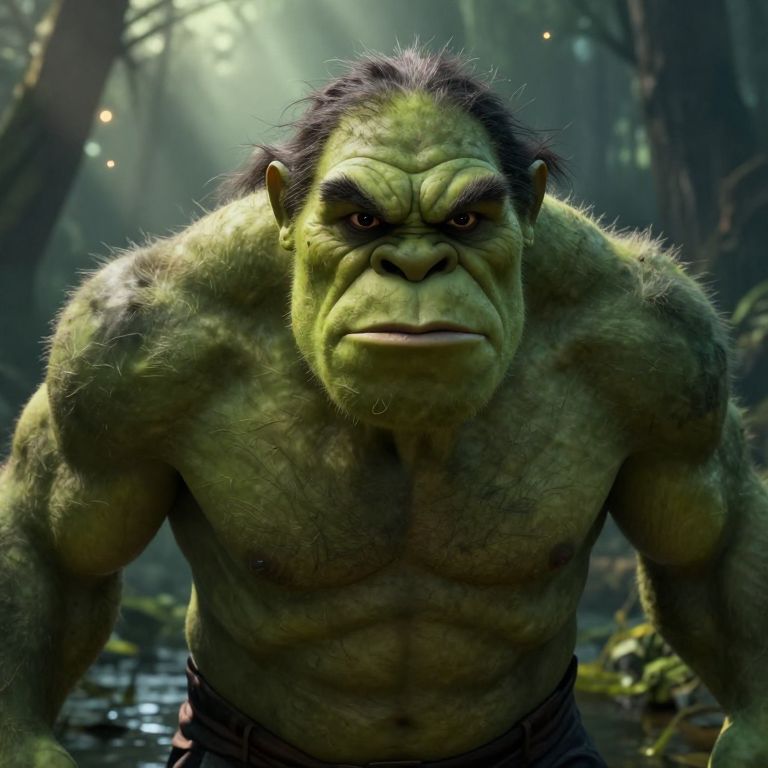 The image depicts a highly detailed and realistic upper body pose of a green ogre, with dark black eyes and nappy long black hair, facing forward. The ogre's expression is serious and intense, with open, realistic eyes and a growling mouth, suggesting a powerful and menacing presence. The lighting is epic, with god rays and flares illuminating the scene, creating a dramatic and cinematic atmosphere. The background is a dark and dreary swamp, adding to the ominous and foreboding mood of the image. The ogre's muscular physique is accentuated by the lighting, highlighting the texture and definition of his skin and muscles. The overall composition is well-balanced, with the ogre positioned centrally and the lighting creating a sense of depth and dimension. The image is photo-realistic and highly detailed, with a resolution of 8k, capturing every intricate detail of the ogre's appearance and the surrounding environment.