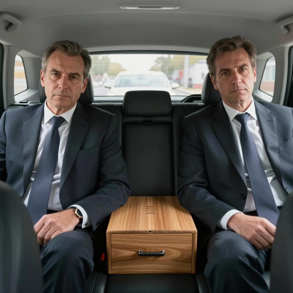 Photograph of two middle-aged men in a car's backseat. Both wear dark suits and ties. Left man leans on a wooden box, hands clasped, serious expression. Right man sits with hands on lap, neutral expression. Car interior, gray seats, sunlight through windows. Background shows blurred car outside.