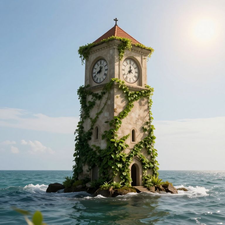 Visualize an ethereal seascape bathed in soft, surreal light, as if painted by a master of dreamlike imagery. An imposing tower dominates the horizon from an elevated viewpoint, its face intricately adorned with delicate, seashell-inspired details that shimmer on the water's surface. The interplay between the ever-changing tides and the sand creates mesmerizing patterns, blurring the lines between reality and fantasy in a landscape that seems to defy time itself.