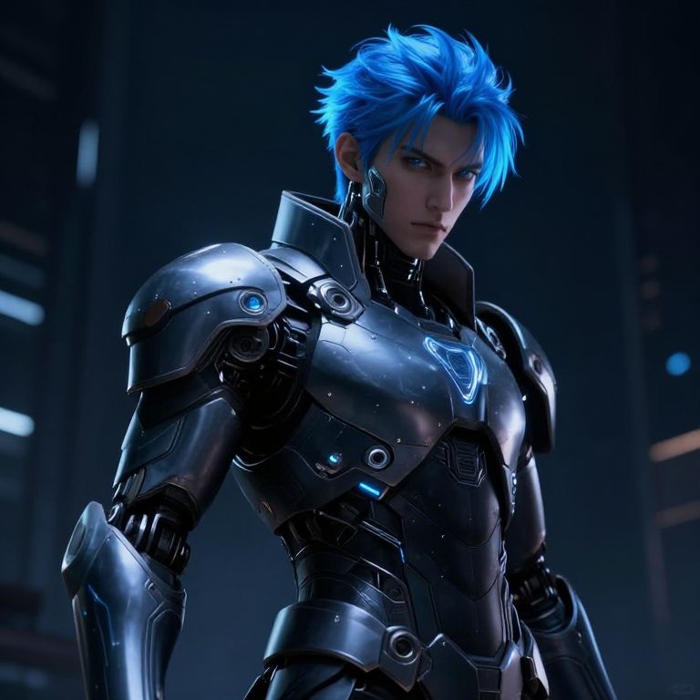 Photorealistic CGI image of a young man with striking blue, spiky hair and piercing blue eyes. He wears a sleek, black, futuristic armor with glossy, metallic surfaces and intricate, glowing blue circuits on the chest plate. The background is a dark, futuristic setting with blue and black hues, suggesting a high-tech environment. The man's expression is serious and focused, with a slight frown. His armor fits closely, highlighting his muscular build. The lighting emphasizes the armor's shiny texture and the blue accents. The overall style is sci-fi and futuristic.
