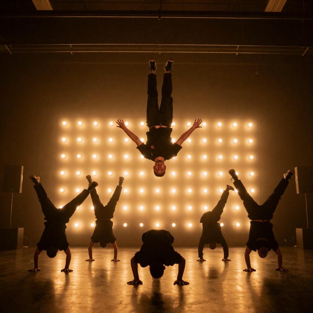 Photograph of a group of eight male dancers in black and purple outfits with matching caps, performing in front of illuminated bulbs. They stand in a line with arms crossed, on a wooden stage. Vibrant pink and white patterned wall in background. Dancers wear platform shoes. Their expressions are focused and serious. Background includes black speakers.