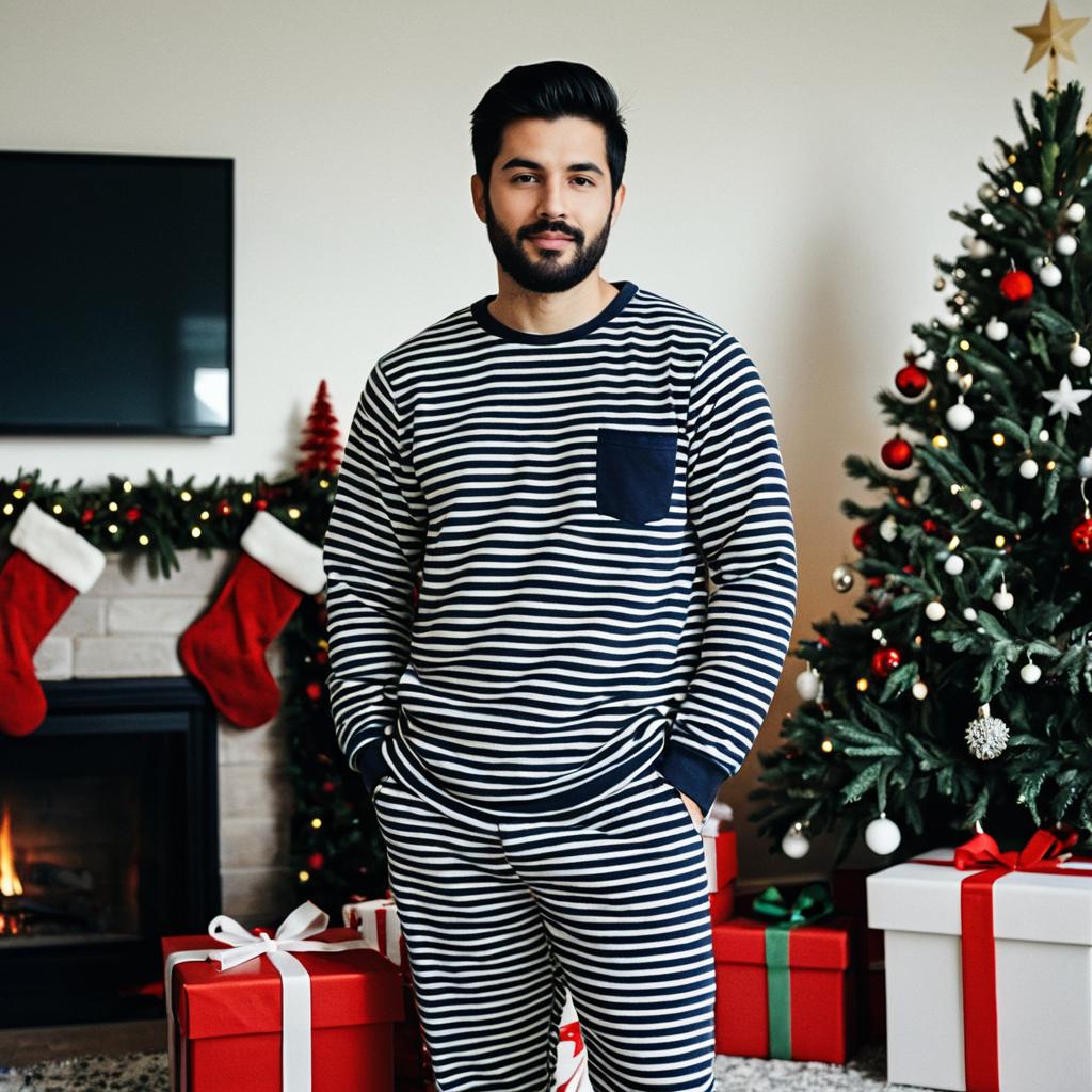 Retro attire christmas party,male focus, christmas tree, 1boy, necktie, hat, christmas, santa hat, brown pants, jacket, pants, vest, shirt, solo, christmas ornaments, white shirt, black hair, facial hair, looking at viewer, realistic, indoors, standing, gift, collared shirt