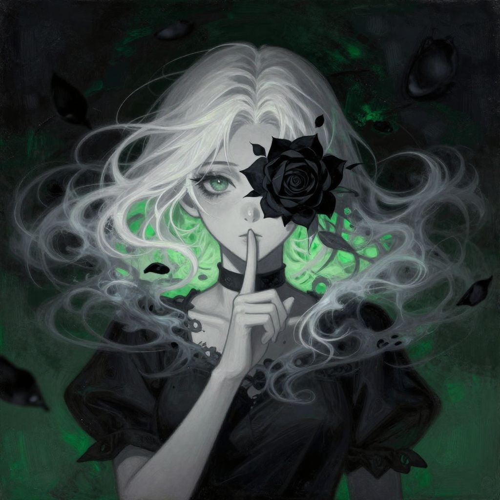 An Acrylic style painting that is expressive, gives it a dynamic and emotional quality, 1980s Retro Anime art of a stylized portrait of an elf girl with a ethereal black and teal mist surrounding her body, The mist creates a dramatic and surreal effect, A red flower, that is blooming, covering one eye, attached to the face with thorns, The woman has a cold aesthetic, complimented by her glowing crimson hair, Anime art of woman draped in shadows with a moonbeam that enhances her unique features, The background is dark blues, filled with black rose petals, A soft gentle smile, sbfte, detail eyes, magic eyes, de01