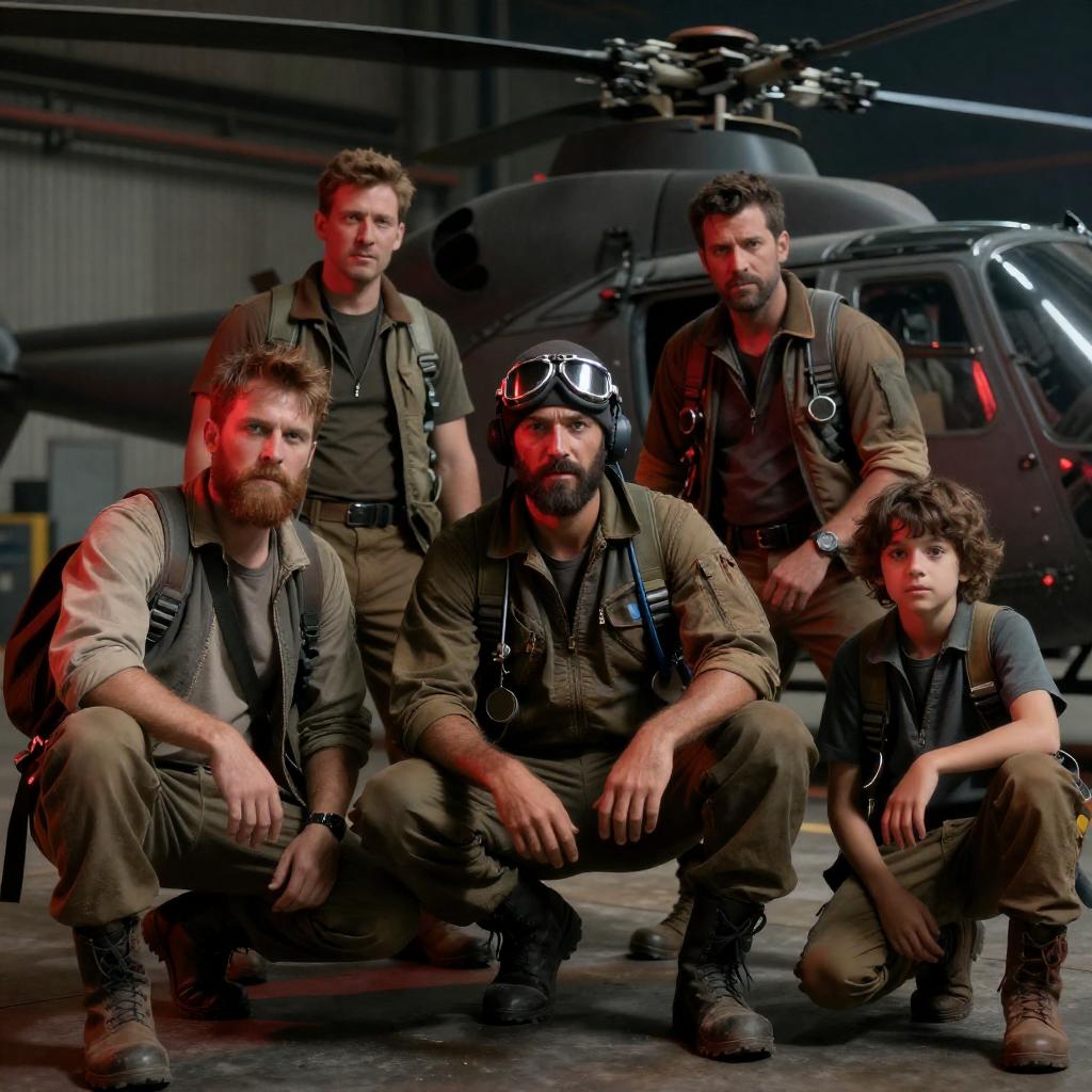 Five men in rugged, dusty clothing and flight gear, crouching together in an industrial, dimly lit setting. Helicopter in background. Red lighting casts shadows on their faces. Bearded man in front, pilot with goggles in center, others with intense expressions. One child in brown hair on right. Helicopter's rotor visible.