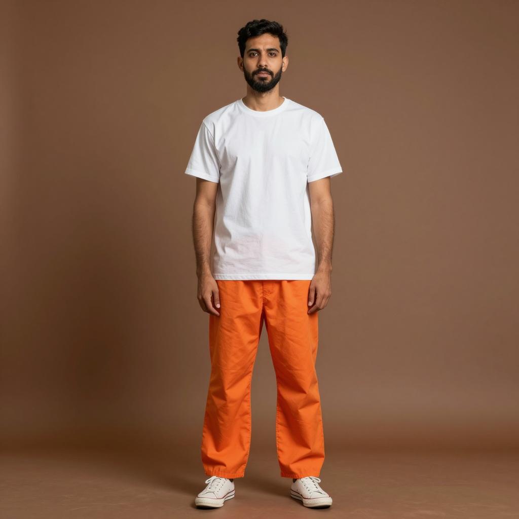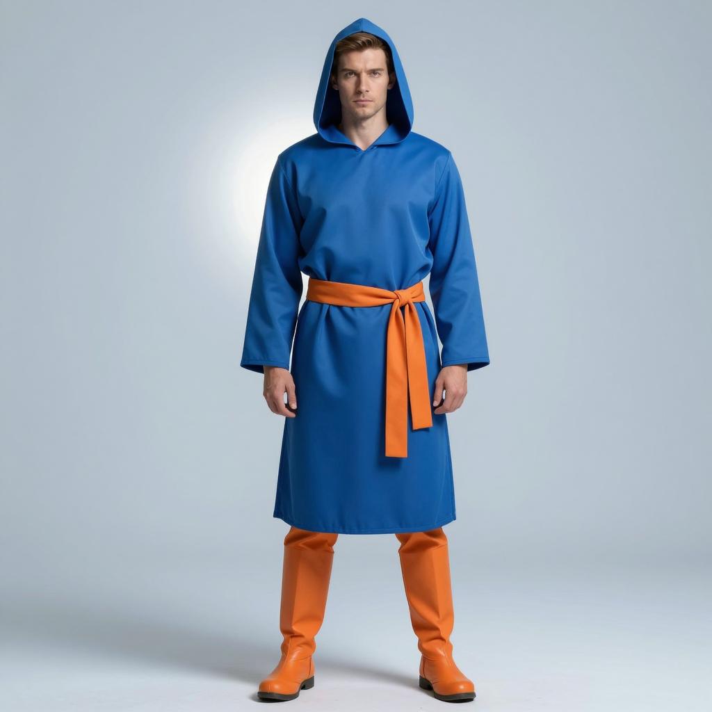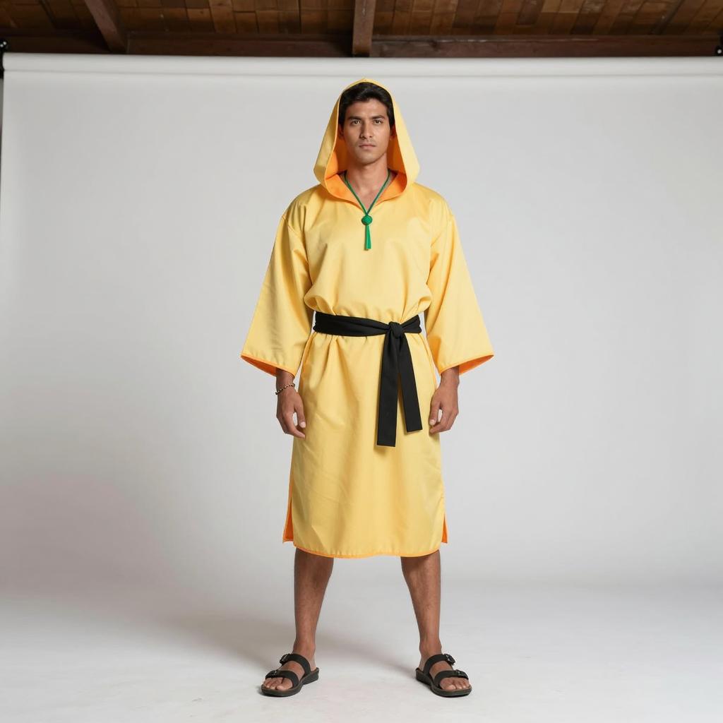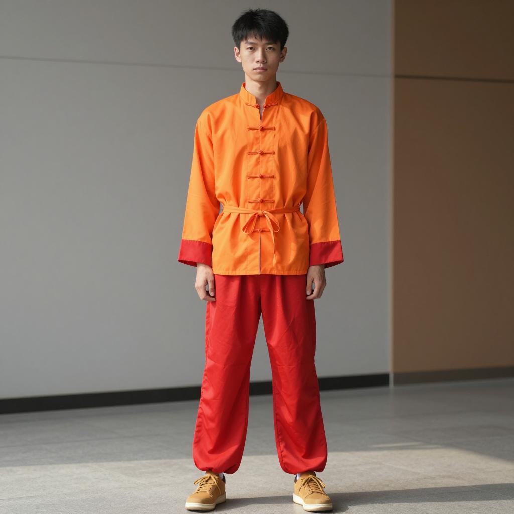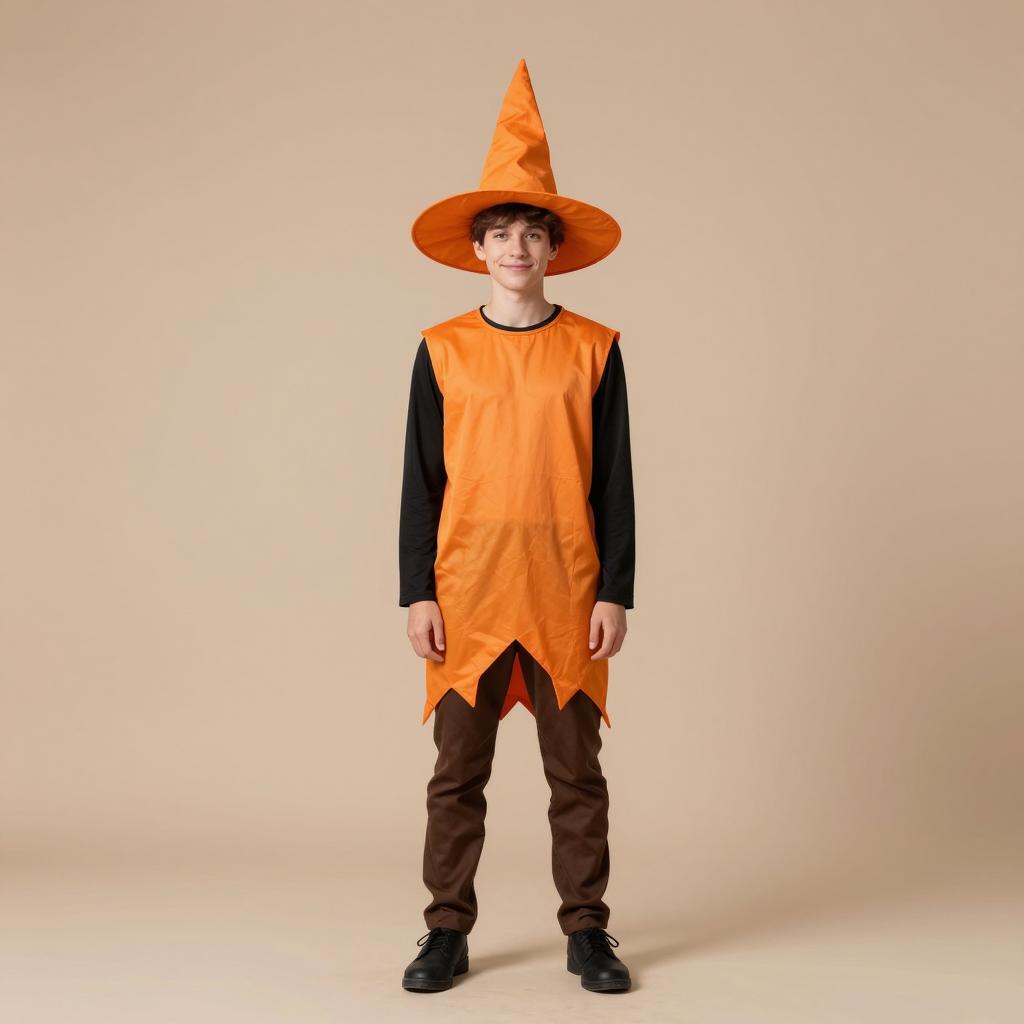 Punny costume fancy dress, photograph of a man, standing, full body, wearing pink traditional outfit, long-sleeve shirt with buttons, matching knee-length skirt with orange trim, white socks, black shoes, small pink cap, brown backdrop, studio lighting, neutral expression, short dark hair, light skin, minimalist background, portrait style