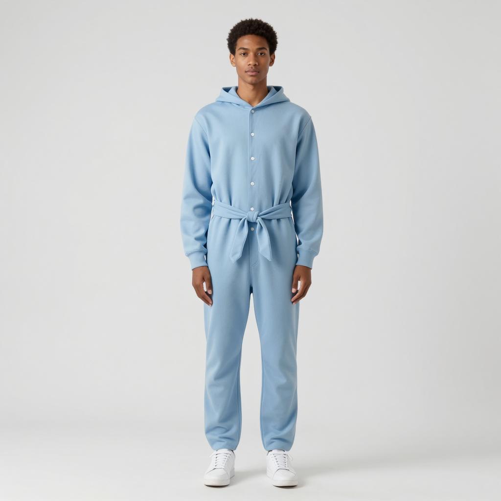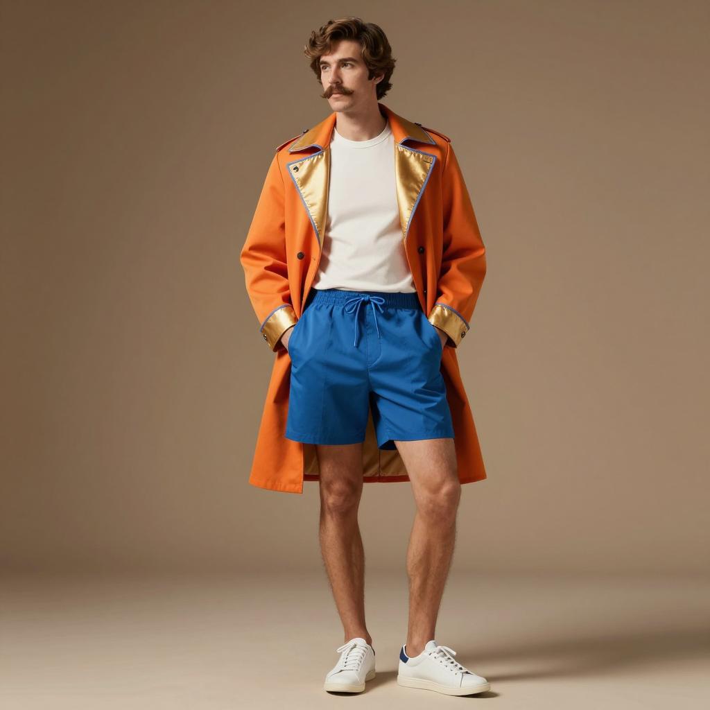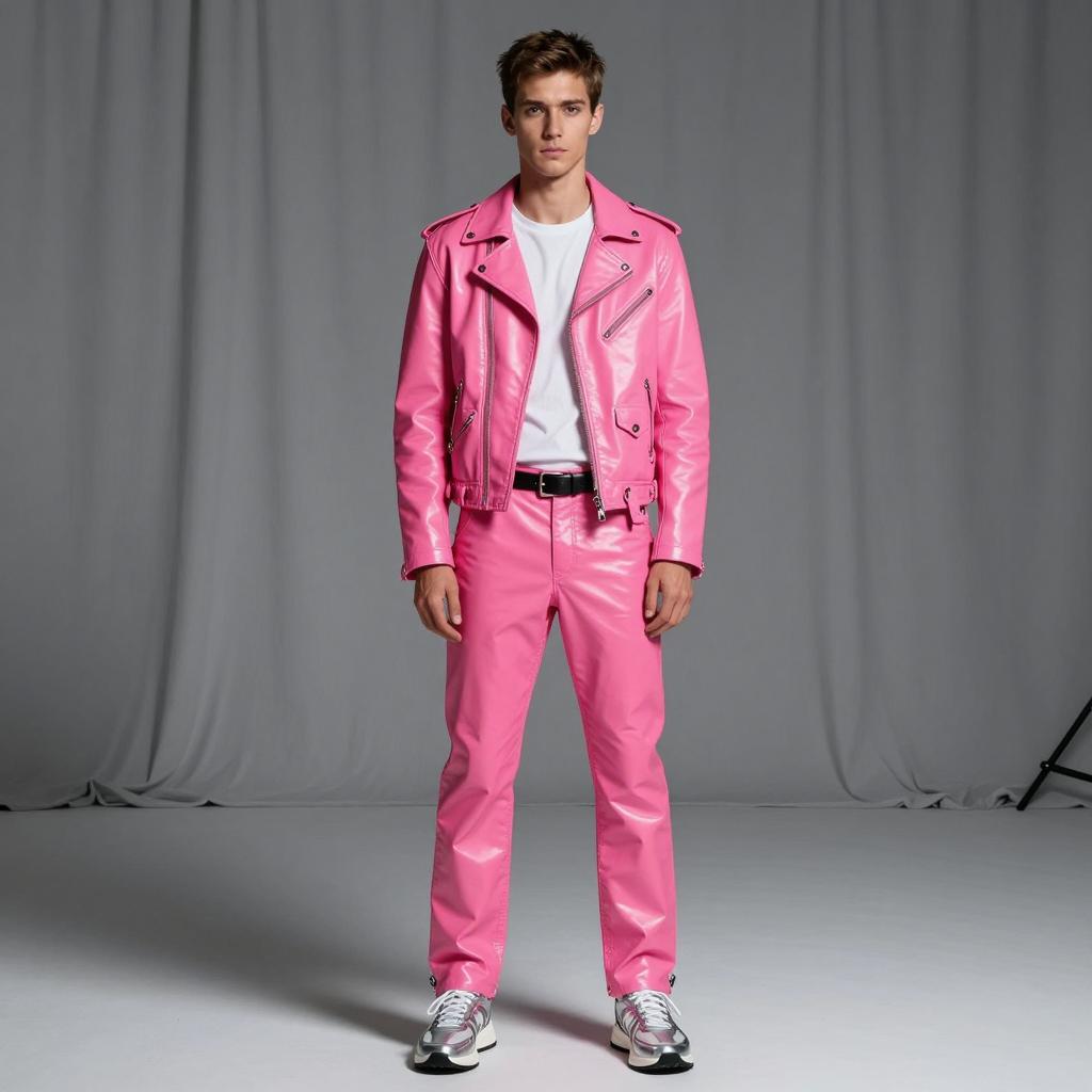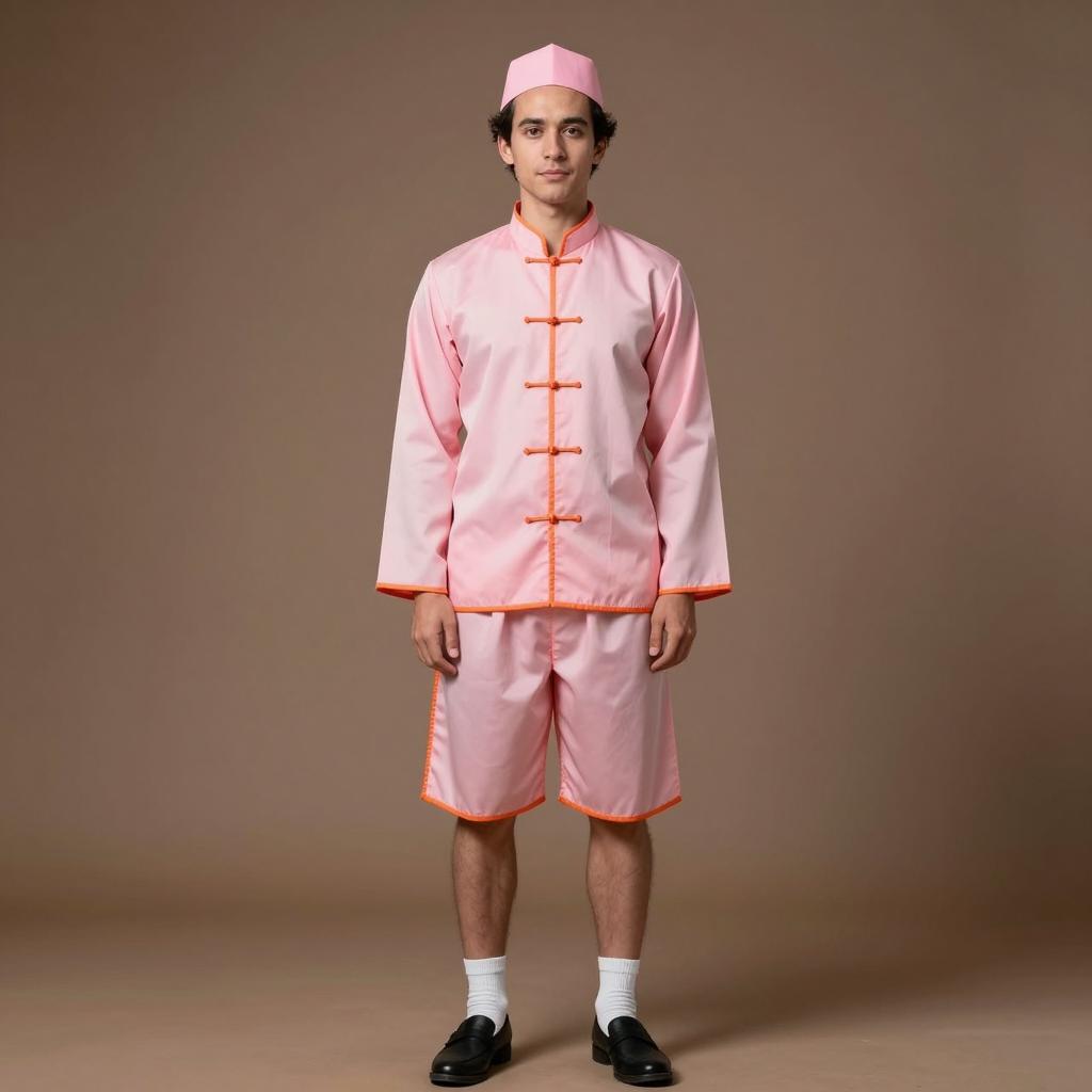 Full-body portrait of a light-skinned man wearing a pink traditional outfit consisting of a long-sleeve shirt with orange buttons and trim, matching knee-length shorts with orange trim, a small pink cap, white socks, and black shoes. The man has short dark hair and a neutral expression, standing against a plain brown backdrop with studio lighting.