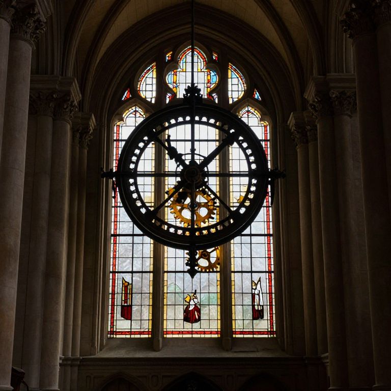 Photograph of a Gothic-style church interior featuring a large, arched stained glass window with intricate geometric patterns. Central to the window is a dark, ornate circular metal frame resembling an industrial cogwheel, casting a silhouette against the colorful glass. The stained glass displays a mix of red, yellow, and white hues. Below the window, a small, red-robed figure stands, partially visible. The window is flanked by two tall, stone columns, adding to the grandeur of the setting. The overall lighting is dim, highlighting the window's vibrant colors and the dark metal frame.