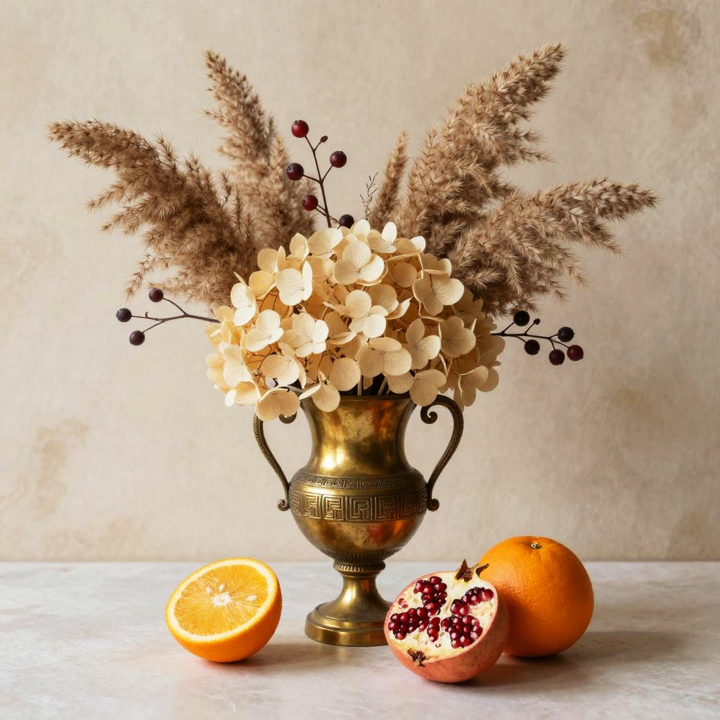 A still life painting of an antique brass urn with embossed geometric patterns brimming with dried pampas grass, cream-colored hydrangeas, and twigs with berries. In front rest a sliced orange with seeds, a halved pomegranate, and a whole orange on a clean surface; the faded parchment textured wall keeps focus on form and color. Warm, balanced composition, soft natural light, gentle shadows, crisp edges, high detail, tasteful negative space, editorial quality, SDXL ready.