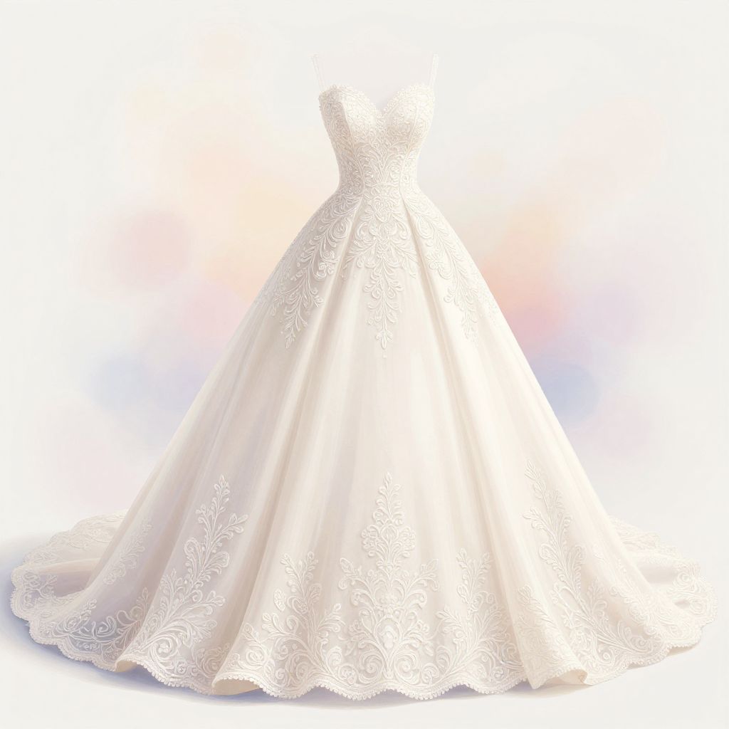 Wedding dress art, elegant bridal gown design with intricate lace details and flowing silk fabric, soft pastel color palette, ethereal lighting, delicate floral embroidery, dreamy background with soft bokeh, high fashion illustration style