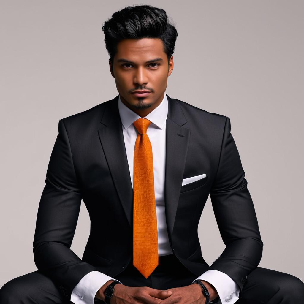 1boy, male focus, solo, necktie, suit, formal, sitting, black hair, simple background, looking at viewer, dark skin, dark-skinned male, shirt, closed mouth, pants, facial hair, realistic, white necktie, long sleeves, jacket, white shirt, black eyes, black necktie, manly, orange background