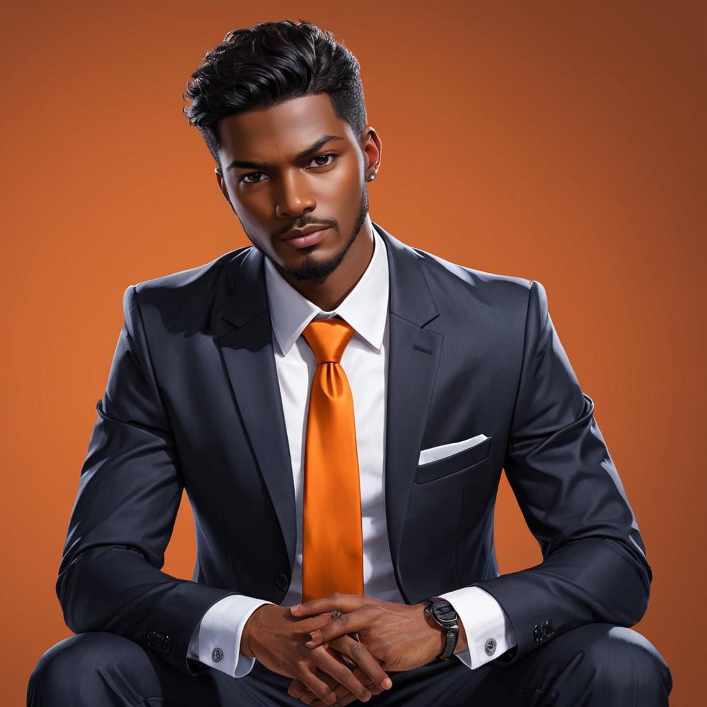 Portrait of a confident young black man wearing a white dress shirt and a bright orange tie, sitting with a serious expression. The background features a gradient from orange to light gray, complementing the tie color. The man has short curly hair and is accessorized with a wristwatch.
