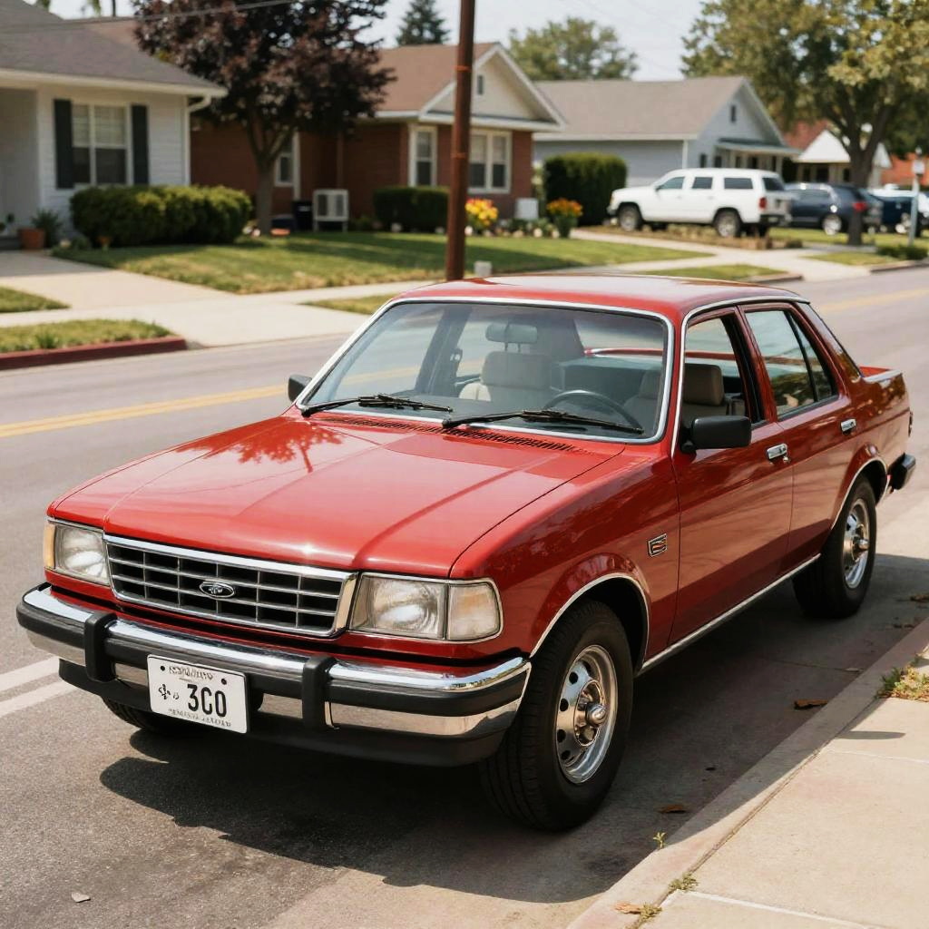 1990 Ford Fusion, classic American car, vintage style, photorealistic, parked on a sunny suburban street, detailed chrome and red paint, 90s vibe