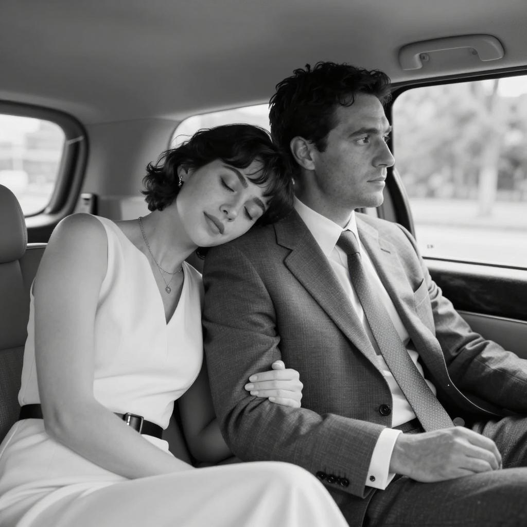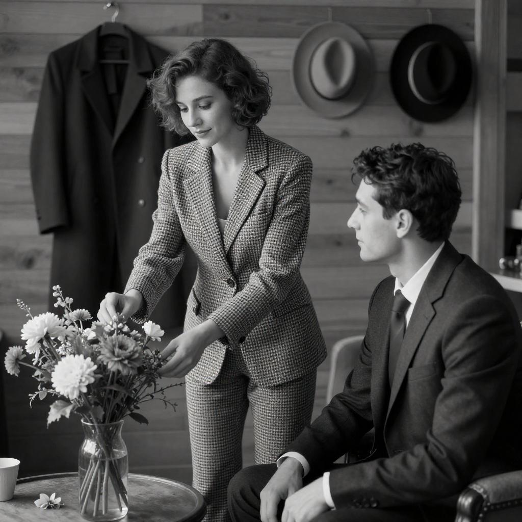 Black-and-white photograph. Woman in checkered suit with short, wavy hair, standing, arranging flowers. Man in dark suit, sitting, looking at her. Background: wooden wall, coat, hat, armchair. Woman smiling slightly, man with neutral expression. Flower vase in foreground.