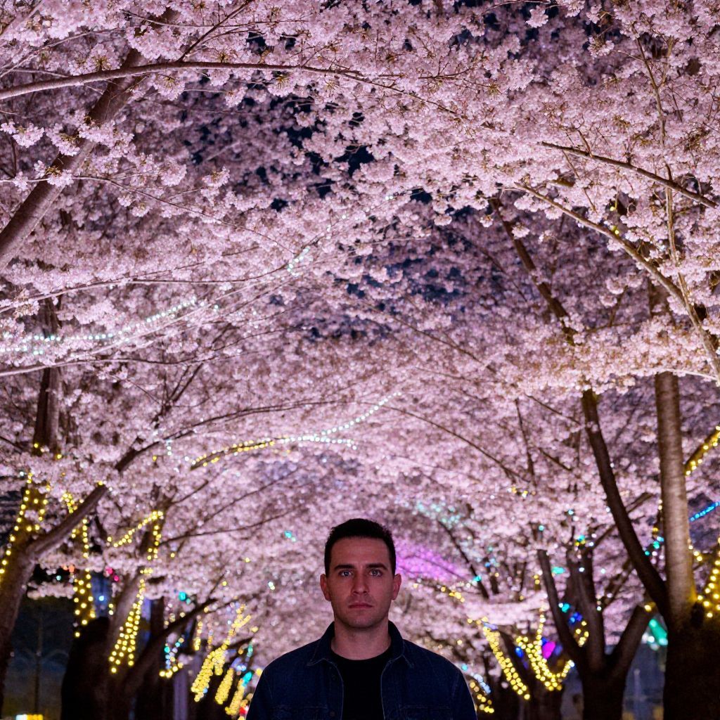 Captivating scene: A man stands beneath an enchanting canopy of blooming cherry blossom trees, bathed in the soft glow of vibrant LED lights that dance across their delicate petals. The juxtaposition of organic beauty and futuristic illumination creates an otherworldly ambiance, as if nature itself has been infused with technology. Man has masculine face and piercing eyes