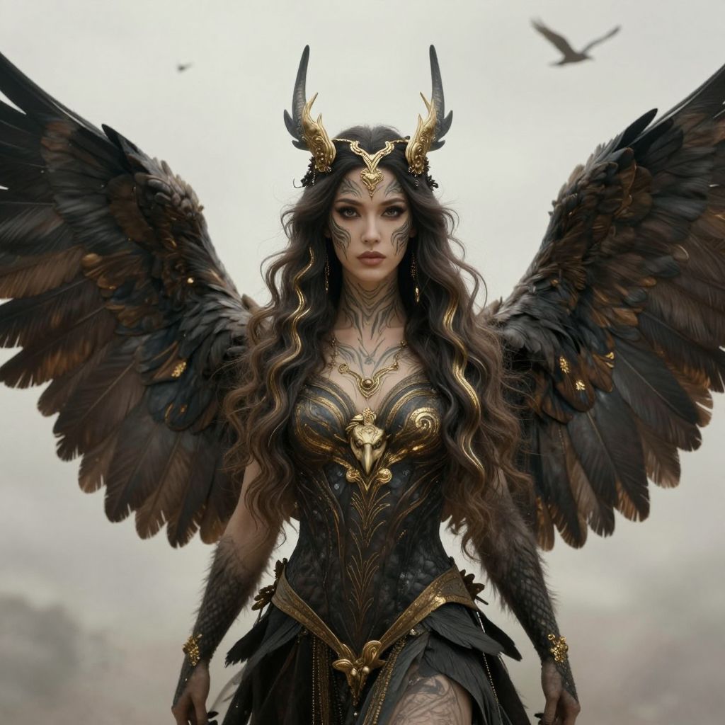 The image depicts a beautifully rendered female harpy, a mythical creature with the body of a woman and the wings and head of an eagle. She has long, wavy hair adorned with intricate gold and black patterns, and her face is marked with similar designs. The harpy's wings are detailed with dark feathers, and she wears a golden headpiece that complements her elaborate attire. The background is a soft, ethereal blend of light and shadow, with a few small birds flying in the distance, adding to the mystical atmosphere. The overall composition is balanced, with the harpy centrally positioned and the elements around her creating a harmonious visual narrative.