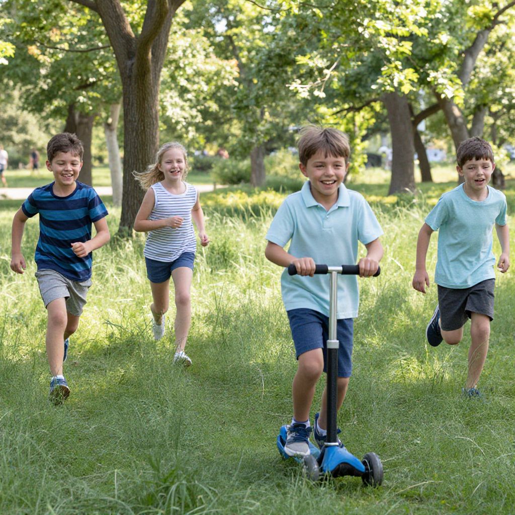 Kids photo prompts: A sunny backyard filled with playful children laughing and running, natural sunlight filtering through trees, colorful toys scattered on grass, warm and authentic family moment captured with a soft focus and candid angles.