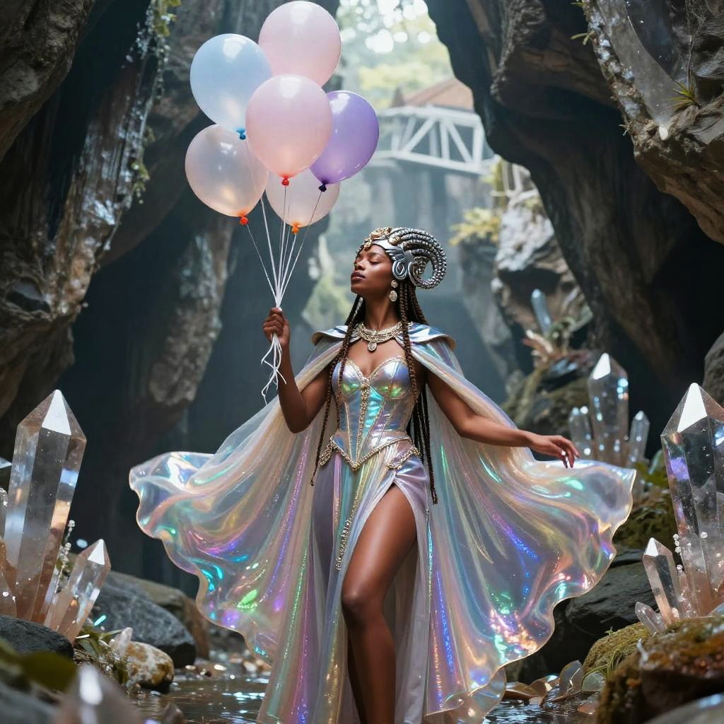 Afrofuturism woman with metallic braided crown, holding helium balloons, dressed in flowing iridescent cape and bodice, floating crystal caves background.
