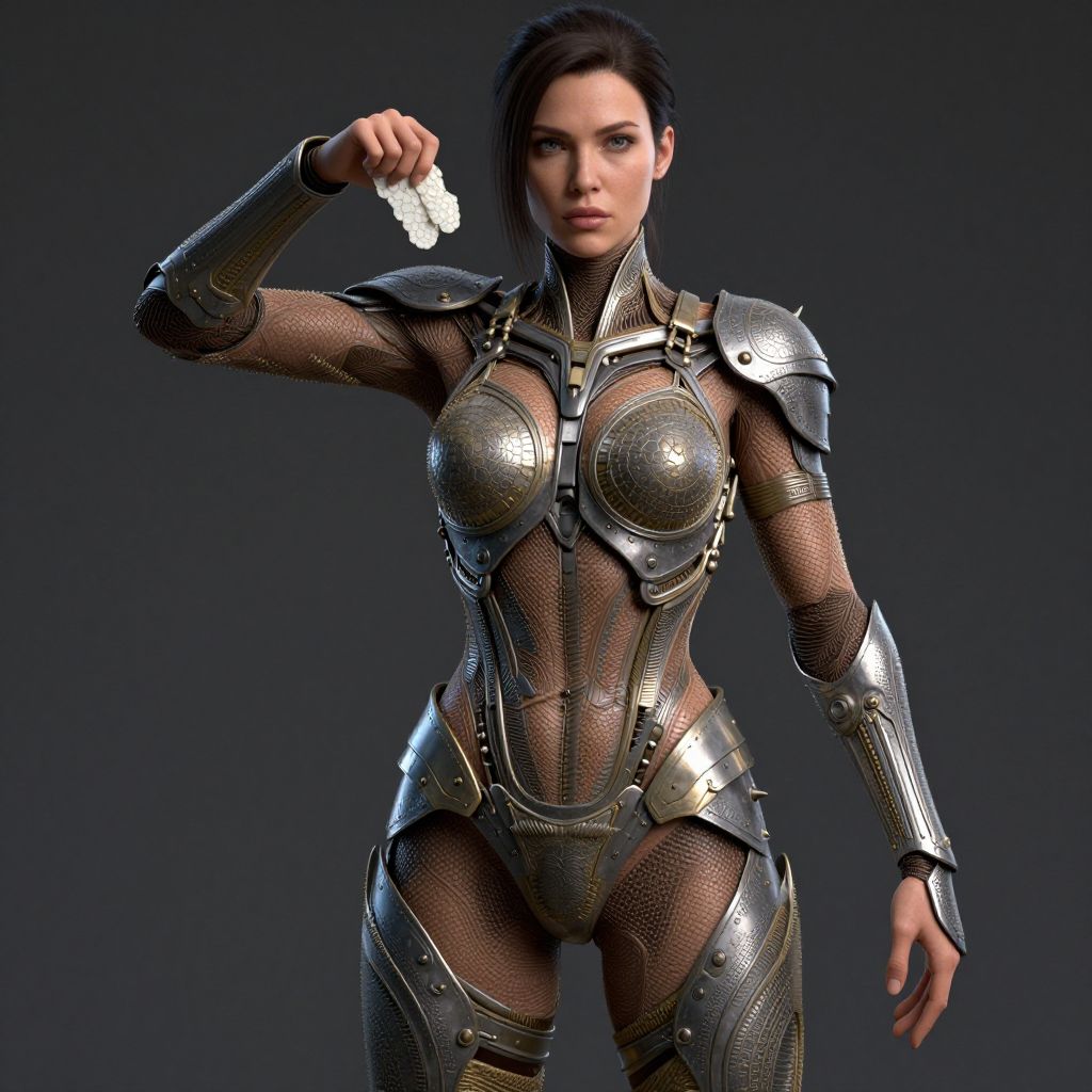 A hyperrealistic digital art piece of a woman shedding her skin, revealing intricate, ultra-detailed body armor with sharp focus and professional lighting.