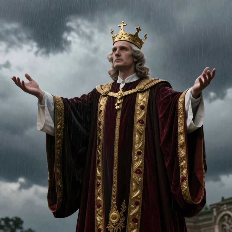Photograph of a regal, fair-skinned man with long, wavy gray hair, wearing a gold crown and a rich, dark burgundy velvet robe adorned with intricate gold embroidery. His arms are outstretched, palms up, as he stands in a rainy, overcast landscape. The robe's white cuffs peek out from the sleeves. A cloudy, gray sky dominates the background, with a hint of a classical building's edge visible on the right. The man's expression is solemn and commanding, evoking a medieval or royal monarch.