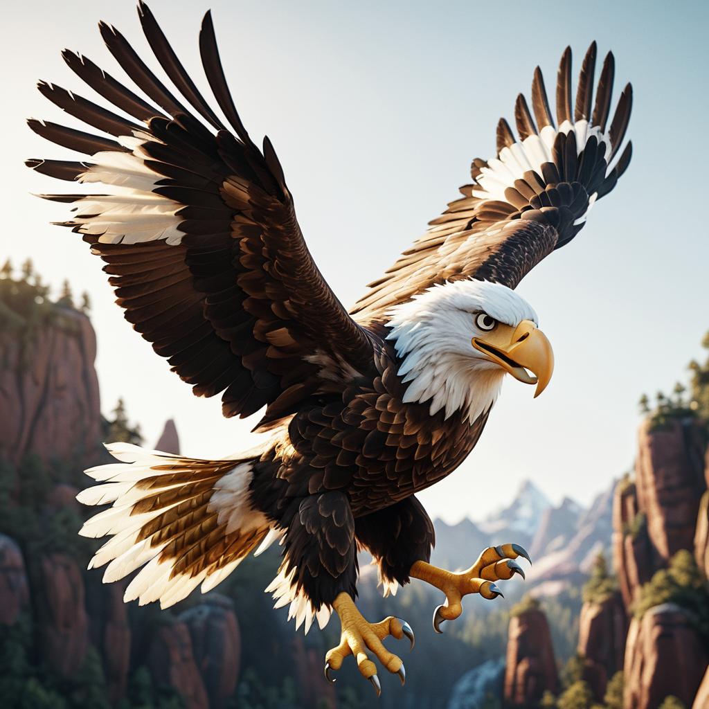 Disney Pixar character, 3D render style, eagle mascot with white and gold feathers, soaring in mid-air, humanoid, cinematic colors