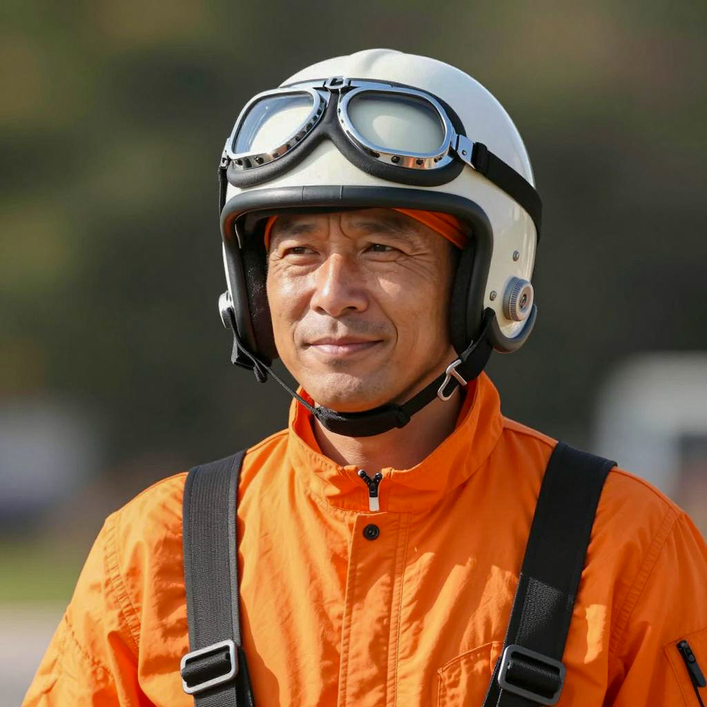 Man in photograph with large, exaggerated smile, wearing purple hat and matching suit with orange shirt and green-striped tie. Dark background, blurred objects. Man's skin is light, face is slightly wrinkled. Head is centered, hat sits slightly tilted. Lighting highlights face, shadows fall on background.