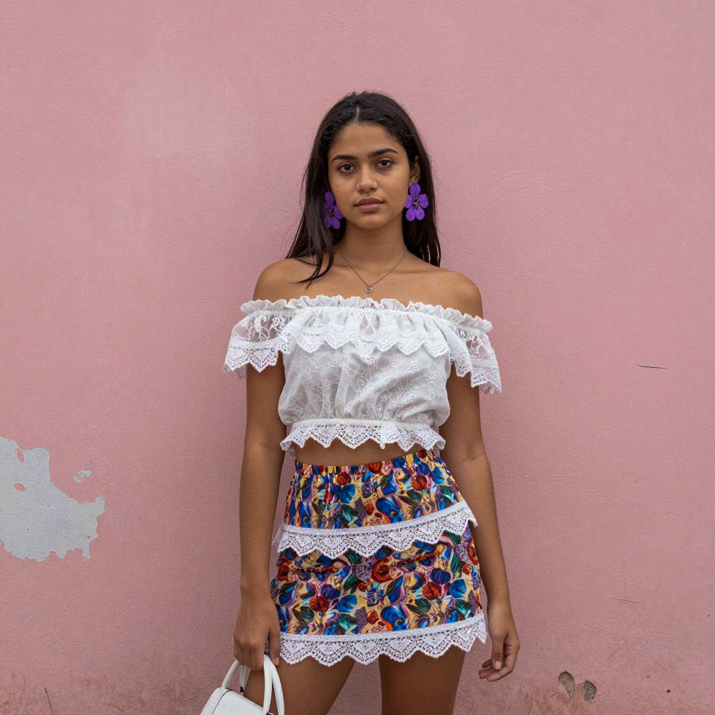 Portrait of a young woman with long dark hair wearing purple flower-shaped earrings and a necklace. She is dressed in an off-shoulder white lace crop top with ruffled edges paired with a colorful high-waisted floral skirt trimmed with white lace. She stands against a worn pink wall holding a white purse and has a neutral facial expression.