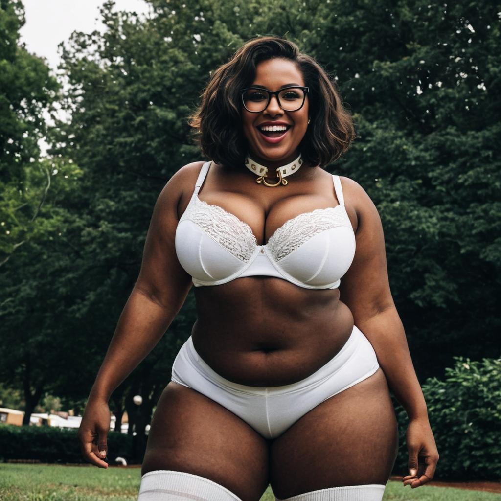 Photograph of a curvy, dark-skinned woman with curly black hair, wearing white sunglasses, a zebra-patterned one-piece swimsuit, white wristbands, and white sneakers. She's crouching against a light blue wall, with one hand touching her neck and the other resting on her knee. Her confident pose and stylish outfit give off a cool, urban vibe. The background is simple and uncluttered.