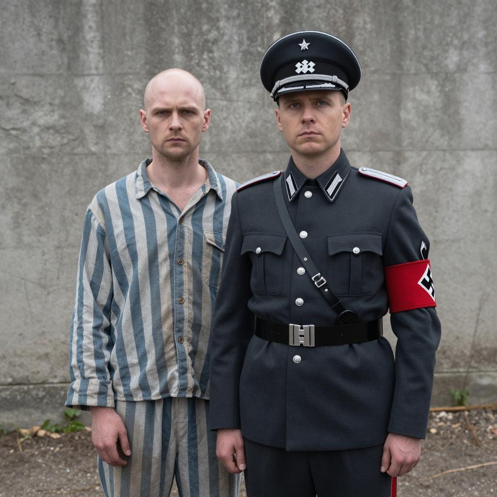 A prison cell. Two men. One in a dark military uniform with a white bandage on his head, squatting. The other, a barefoot man in blue prison clothes, sits on the floor, holding a small child on his lap. Bright light from a window on the back wall. Bed with a blanket on the left. White brick walls. Both men looking at each other.