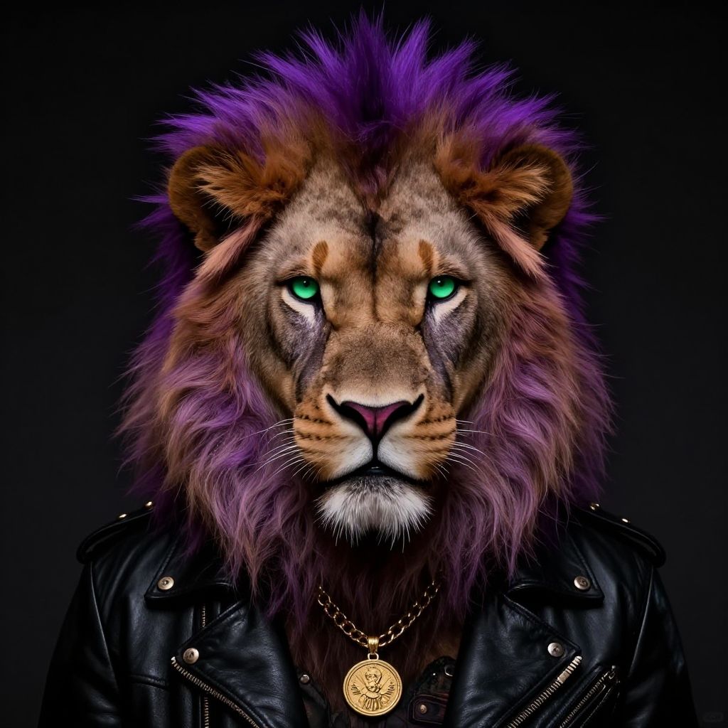 A hyper-realistic digital artwork of a lion with a vivid purple mohawk mane styled in a punk fashion. The lion's face features detailed, dark tribal-like markings, piercing green eyes, and a pink nose. The subject is dressed in a black leather jacket adorned with gold embellishments and wears a prominent gold chain necklace with a medallion. The image is rendered with dark colors and exhibits a lowbrow art style influenced by Mark Ryden.