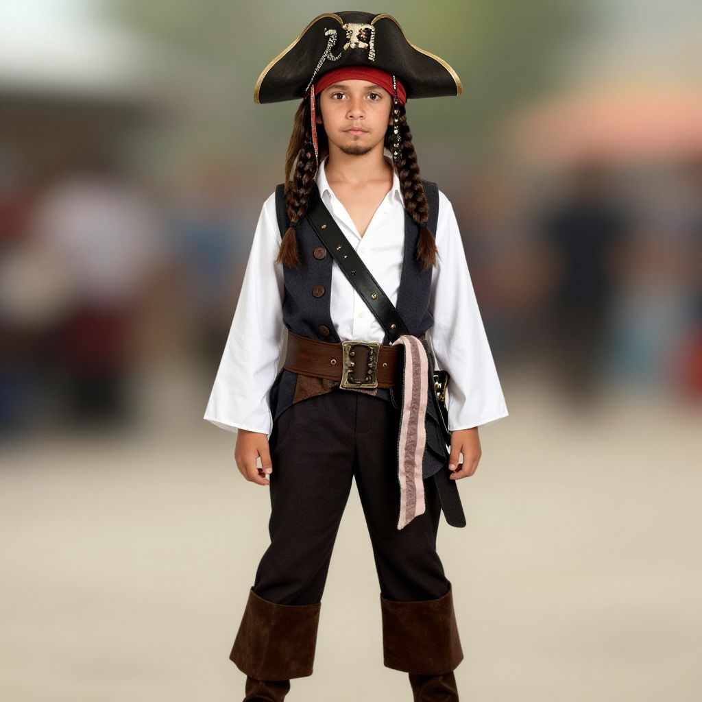 Photograph of a young boy with dark skin, long braided hair, wearing a black pirate hat, white shirt, black vest, and pants,