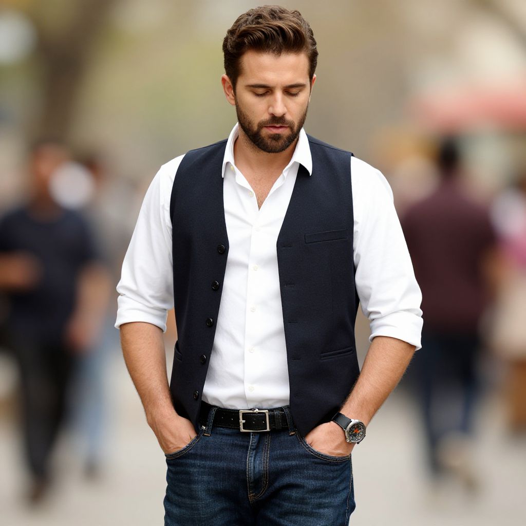 Top gun outfit man, 1boy, male focus, solo, watch, facial hair, vest, wristwatch, shirt, pants, belt, denim, white shirt, beard, closed eyes, flower, jeans, blurry, blurry background, hands in pockets, brown hair