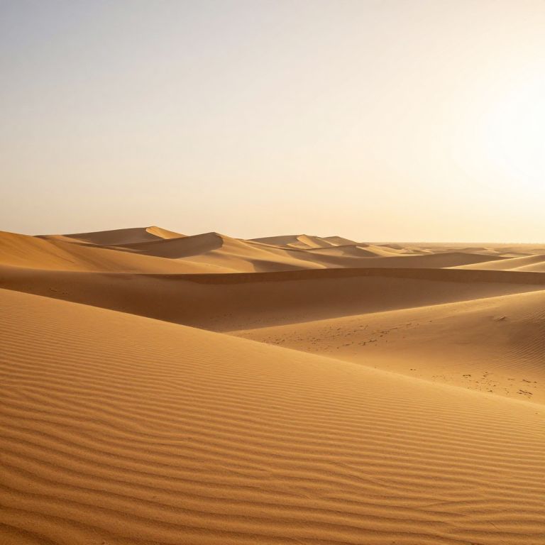 Golden sand dunes stretch endlessly under a hazy sky, their smooth, rippled surfaces reflecting the warm hues of the setting sun as they gently shift with the whispering winds.