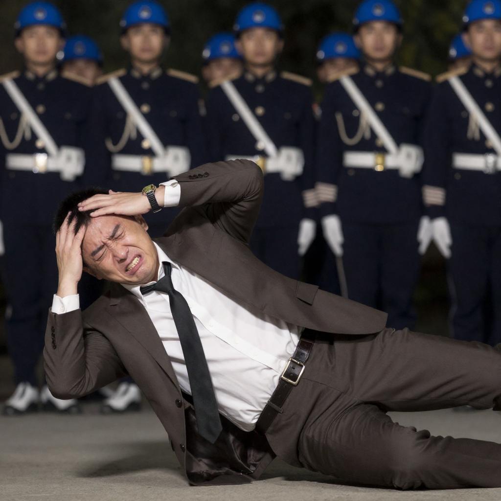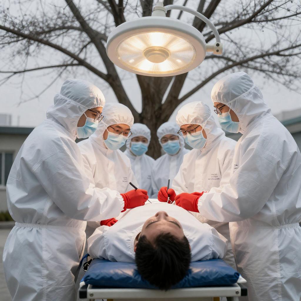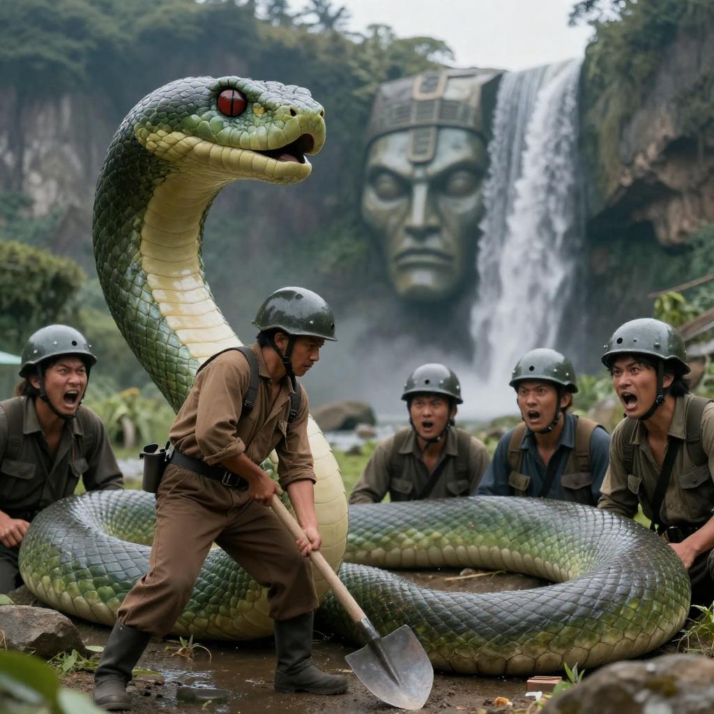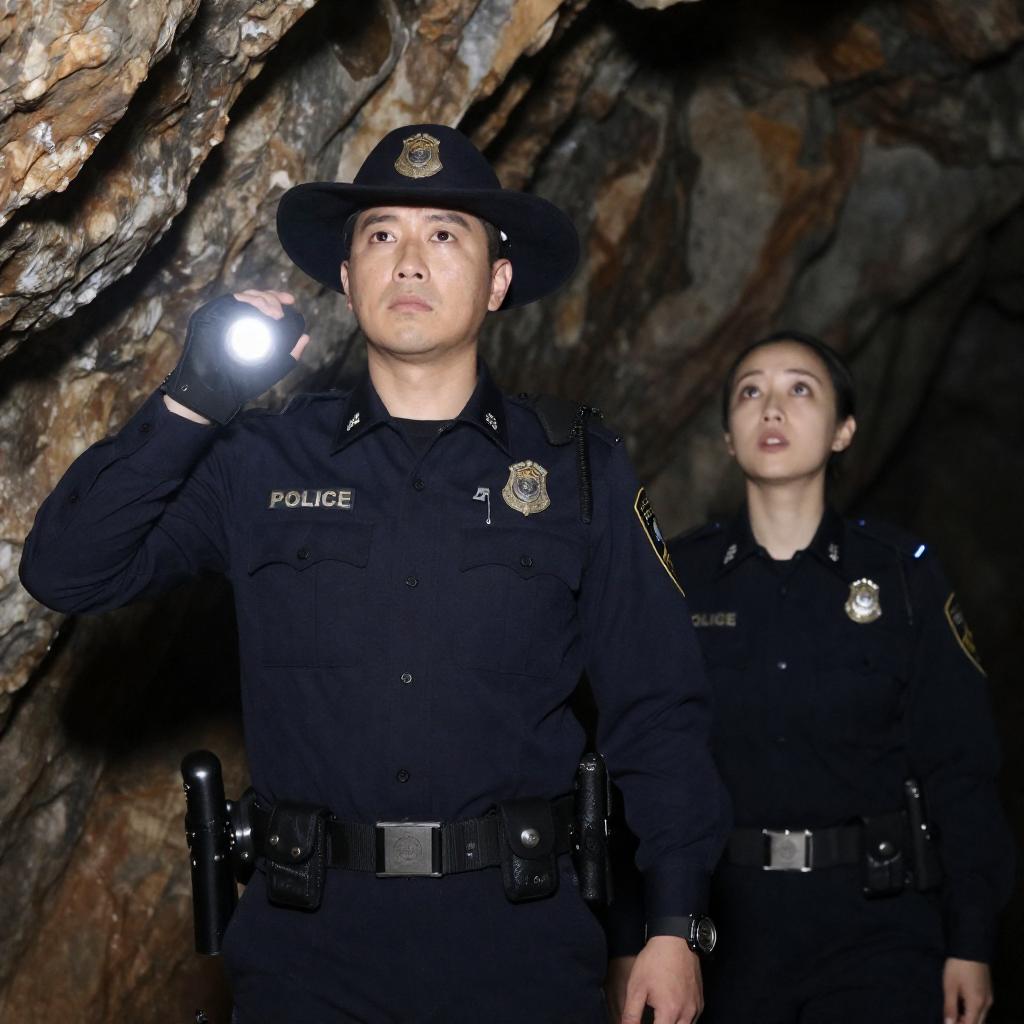 Three men in orange uniforms and helmets, standing outdoors, pointing lightning rods emitting blue lightning. Dense green forest background. Men have focused expressions, wearing black gloves, white shirts, and black belts. Bright daylight.