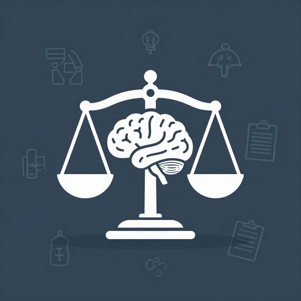 Digital illustration of a white balance scale with a brain replacing the central weight on a dark blue background, surrounded by faint icons of documents and a clipboard.