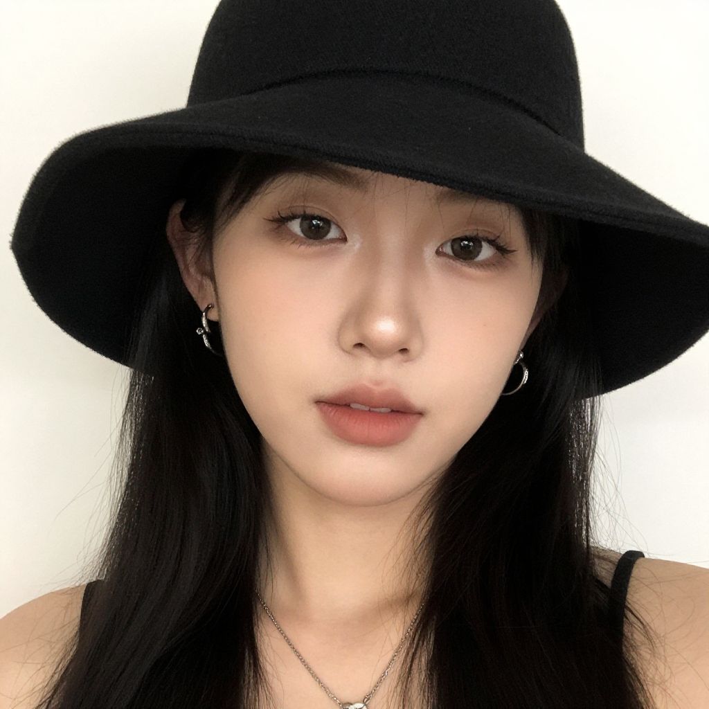This is a digitally edited photograph of an East Asian woman with fair skin and long, straight black hair. She wears a large, black, floppy hat that casts a shadow over her forehead. Her brown eyes are slightly downcast, and she has light pink lips. She is wearing small, silver hoop earrings and a thin, gold necklace. Her black tank top is visible at the shoulders. The background is a plain, white, seamless studio backdrop, emphasizing her facial features and hat. The image has a slightly high-contrast, almost airbrushed style, giving it a polished, contemporary look.