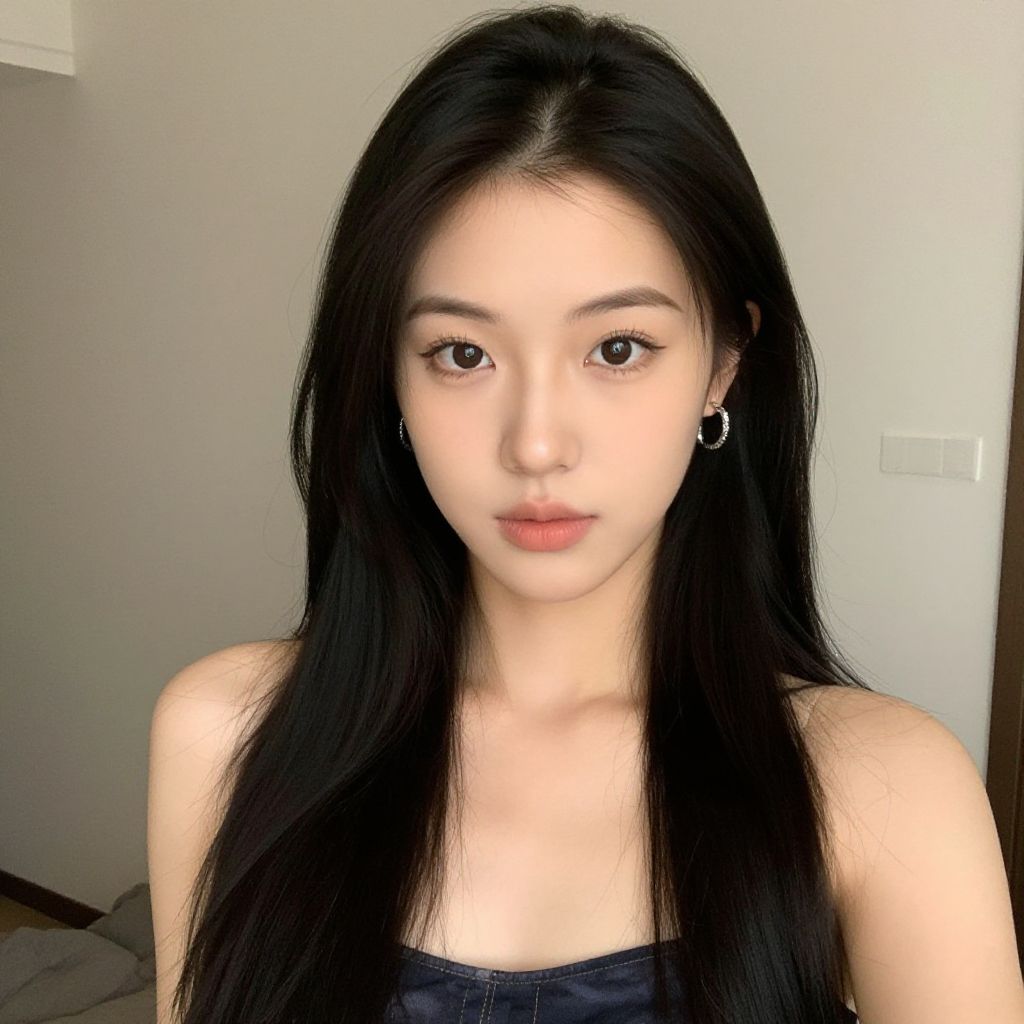 Photograph of an Asian woman with fair skin, long black hair, wearing a black wide-brimmed hat, black tank top, and small hoop