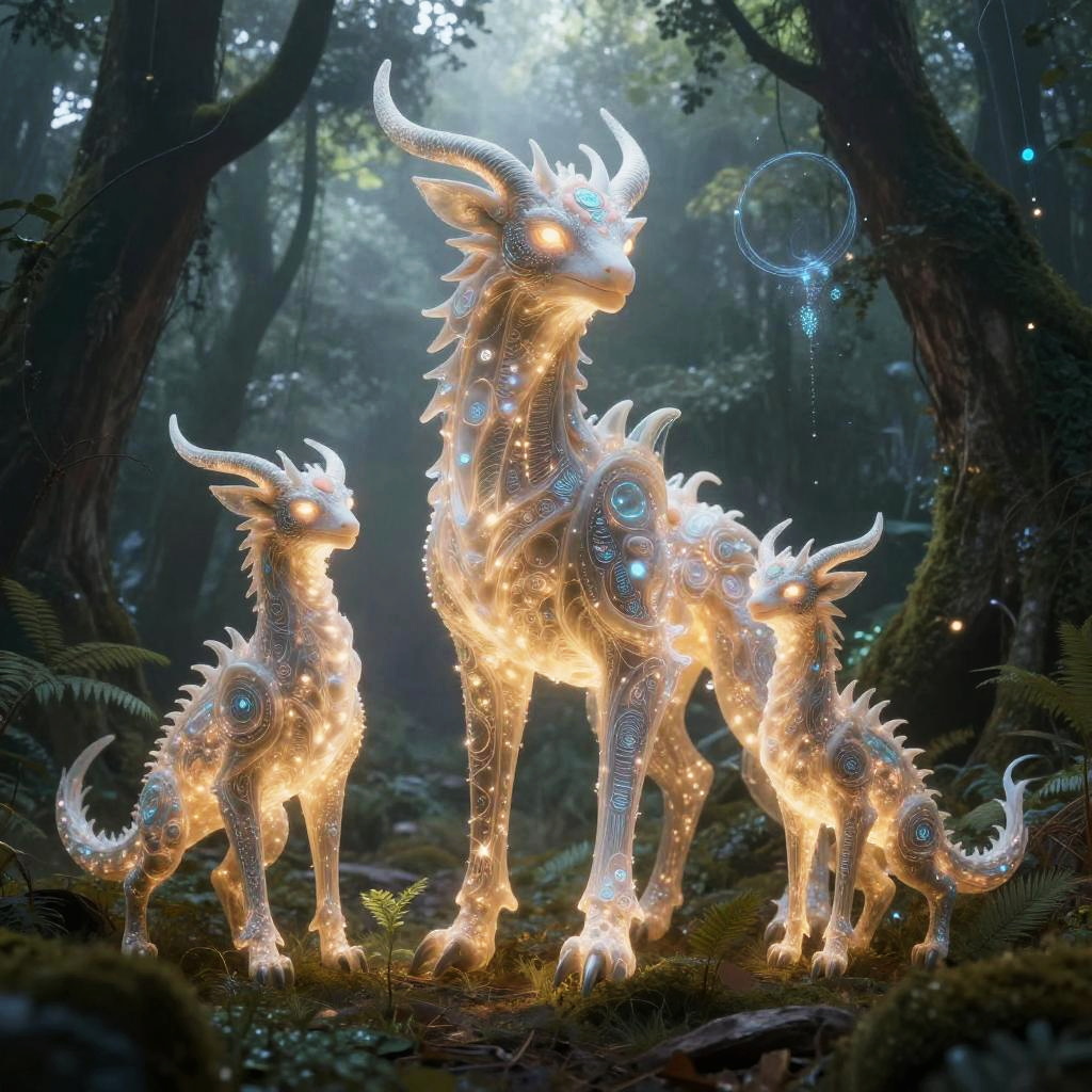 AI art prompt showcasing a fantasy world where artificial intelligence breathes life into mythical creatures, glowing with ethereal light amidst a misty forest, combining organic forms with digital patterns, dramatic lighting, and a dreamlike atmosphere.