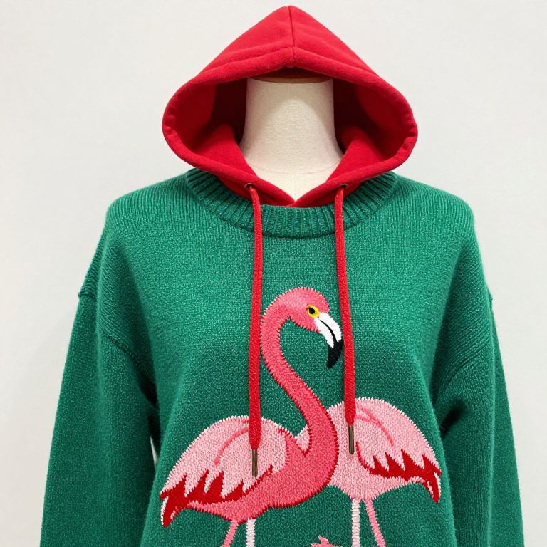 Mannequin wearing a green sweater with a red hoodie on its head. The sweater has a red and white design with a pink flamingo on it.