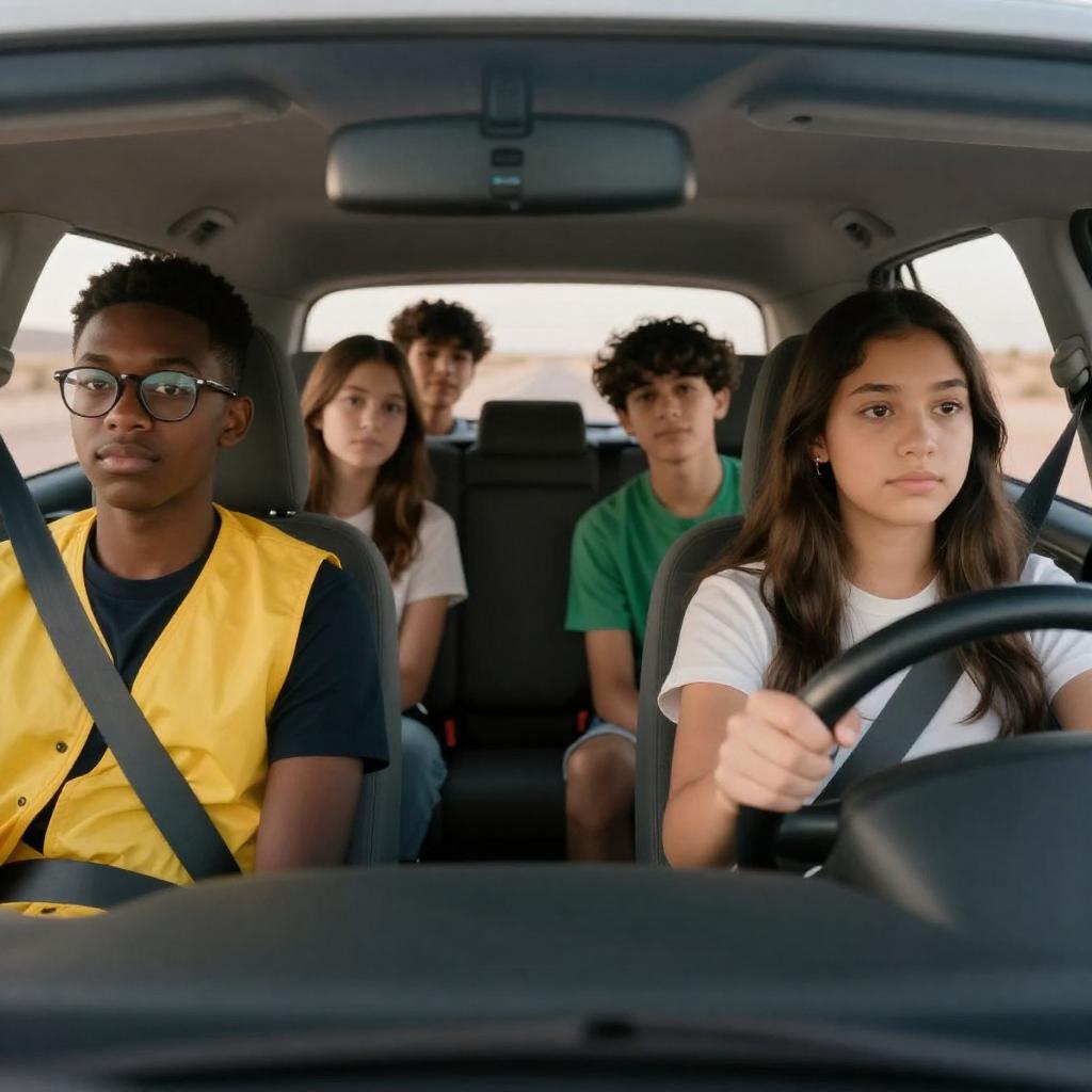 Photograph of a smiling young man with curly dark hair and a white and blue raglan shirt, sitting in the driver's seat of a car at night. A young woman with long brown hair and a dark top sits in the passenger seat, also smiling. The car's interior is dimly lit, with a dark exterior and faintly visible greenery outside.