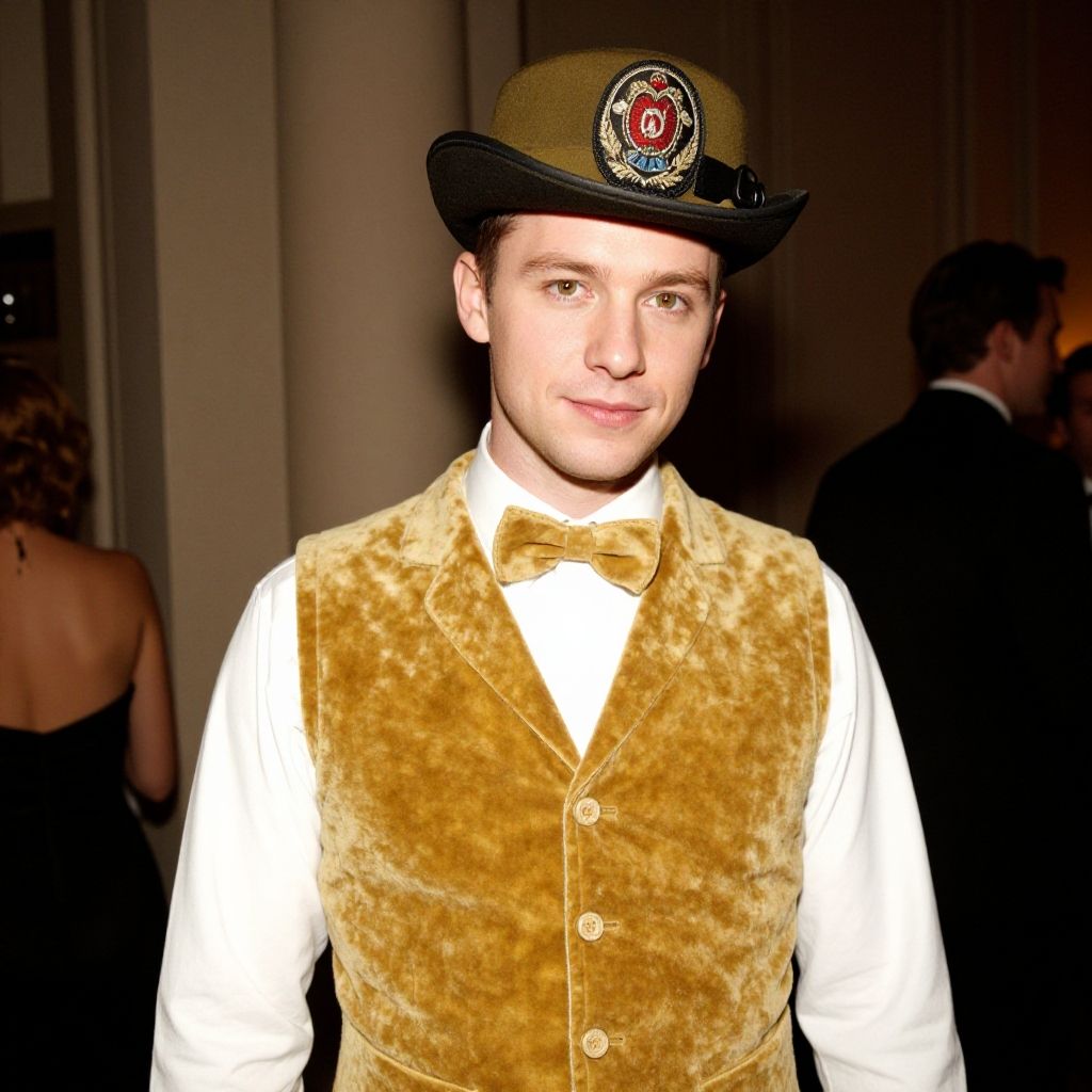 A man in a vintage-themed outfit poses for a candid portrait at a party, wearing a velvet waistcoat with golden accents and a distinctive hat adorned with an embroidered emblem. The warm lighting and classic style evoke a nostalgic and elegant atmosphere.