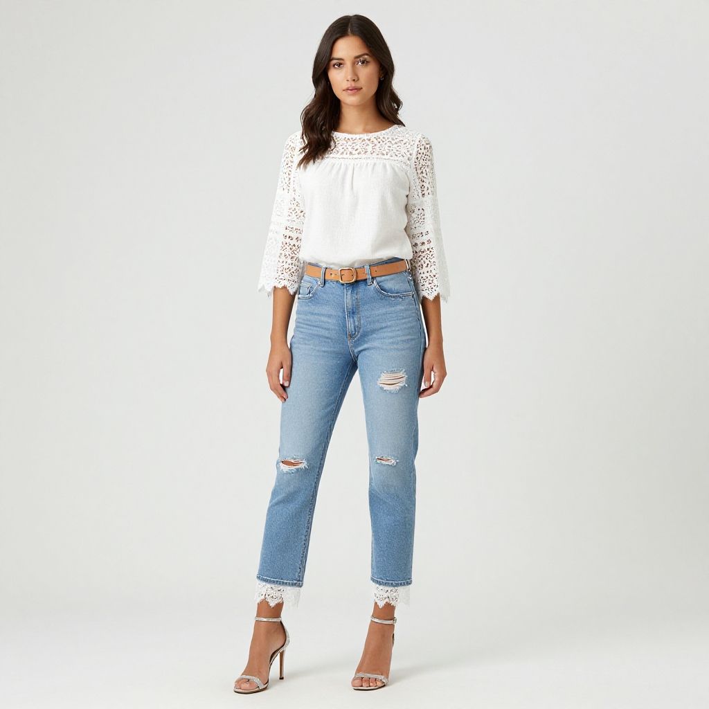 "Casual, semi-sheer blush blouse, round neckline, flared sleeves with crochet lace detailing, denim blue jeans with slight distressing, statement bib necklace with intricate design.. Sexy. Pretty face and beаutiful eyes. Big breasts."
