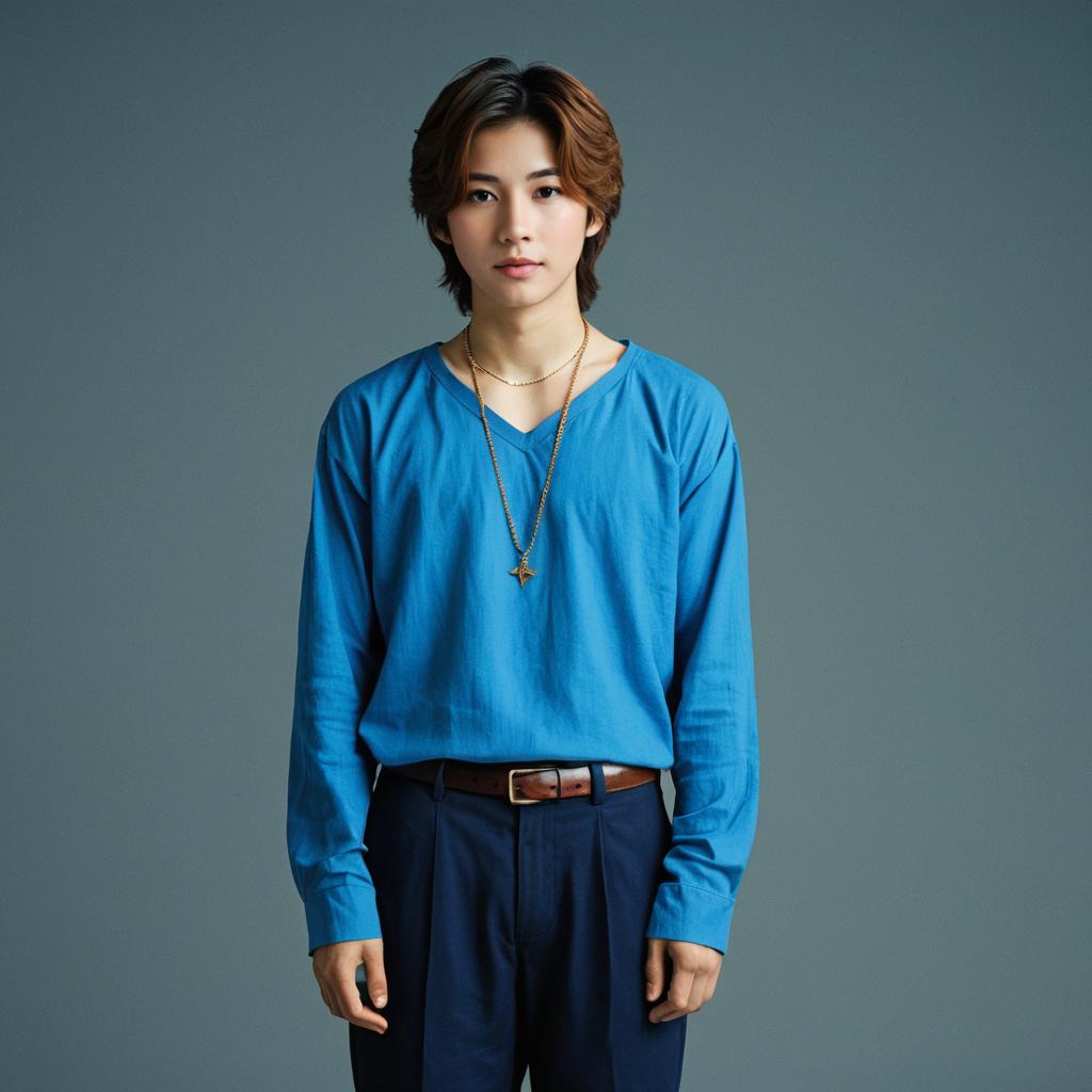 Portrait of an Asian man wearing a detailed Todd Ingram cosplay costume from Scott Pilgrim. The costume features a teal suit with yellow V-shaped patterns, red sleeve cuffs, and a brown belt with a circular buckle. He stands against a neutral background with a calm expression.