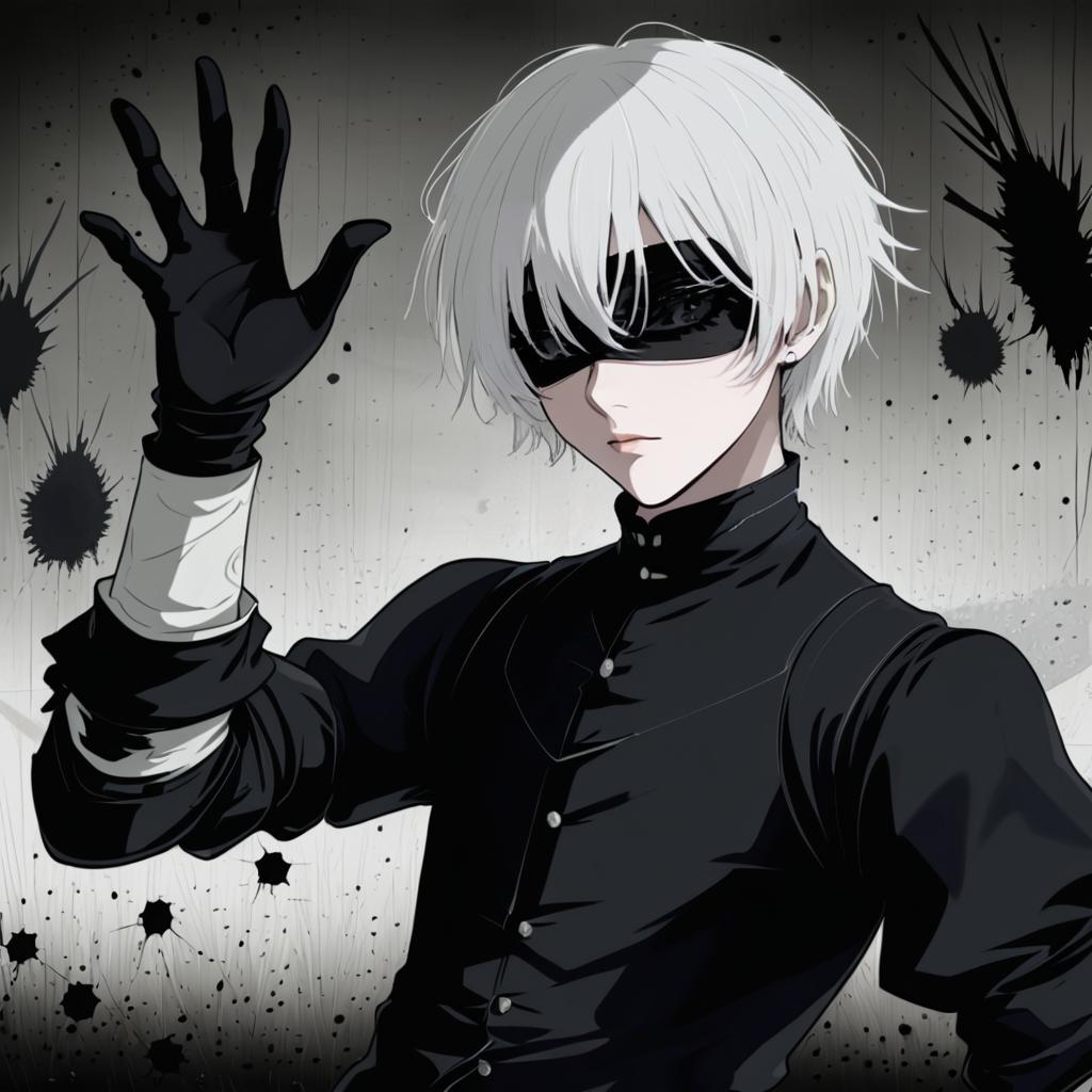 9s (nier:automata), nier (series), 1boy, white hair, short hair, black gloves, black choker, long sleeves, black blindfold, by artist ino (magloid), anime