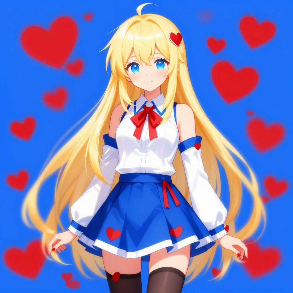 Illustration of an anime-style virtual YouTuber girl with long blonde hair and blue eyes, wearing a white collared shirt with blue trim, a blue skirt with heart designs, black thigh-high stockings, and red ribbons. She has a heart-shaped hair ornament and nail polish, set against a vibrant blue background filled with red hearts.