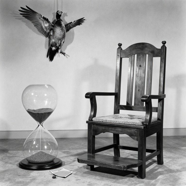 Harmony 1960s sitcom, broken hourglass, taxidermied pheasant, electric chair, set design, black and white, 35 mm, Mitchell BNC, coloring book style,