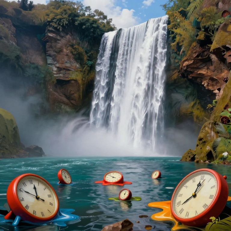 An enchanting digital artwork captures a surreal landscape with a majestic waterfall cascading into a serene pool surrounded by vibrant, melting clocks. The dreamlike quality is achieved through exaggerated perspective, rich textures, and dynamic interplay of light and shadow to evoke wonder and fascination. Emphasize the vivid detail showcasing both rushing water and clock elements from below the falls, highlighting the surreal beauty of this imagined world in a style reminiscent of surrealist paintings.